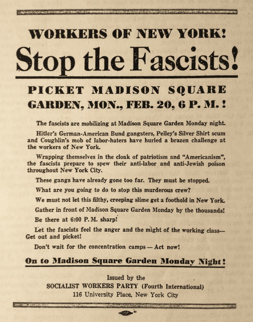 “And if it is said that there should have been strong picket lines around the Garden not to close down the meeting but only as a protest gesture. A simple realistic view of the facts make it obvious that such peaceful picketing would be an immediate target for the combined provocations of the Trotskyites and their companions in arms, the Bundists. The net result would be the same danger as before, feeding the Nazi objective of collisions between the Bund and the vanguard of the democratic forces.” (Daily Worker, Mar. 3, p. 6)