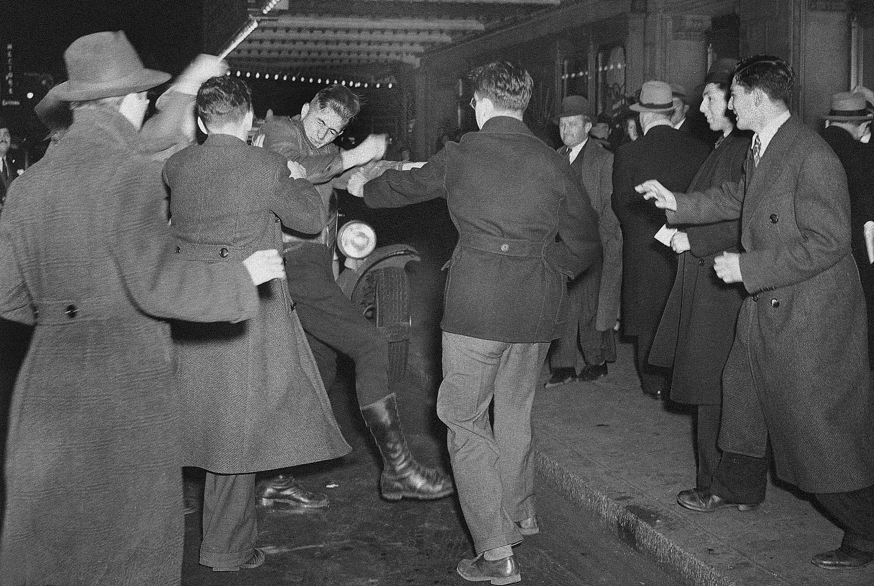 “We are all too familiar with the actions of the police bent on ‘law and order’; the alarming thing in this case is that the city administration, for all Its anti-fascist convictions, gave sanction to the police in what has become their occupational antagonism to all picket lines. Newbold Morris, acting mayor, issued a statement asking the public to show their support of democratic institutions by shunning the assemblage as ‘one would a pestilence.’ A pestilence is not overcome by shunning it; the only effective popular answer to such meetings as that of the Bund is counter-demonstration. The two left groups, the Socialist Workers Party and the Young People’s Socialist League, who insisted on exercising their right to picket, discovered that they and not the Nazis were the ‘enemy.’ They were dispersed by force – and the police become the heroes of the newspapers, of Mayor LaGuardia, and unquestionably of the German-American bund.” (The Nation, Mar. 4, 1939)