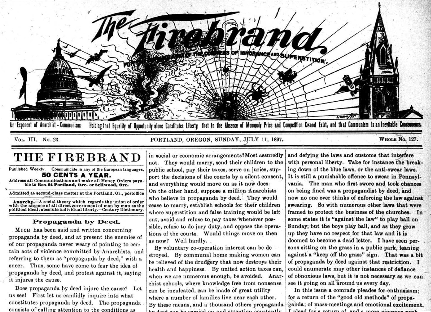 ‘The Firebrand’ was an influential anarchist newspaper founded in 1895 and edited by Abe and Mary Isaak in Portland, Oregon. The Isaak family moved to San Francisco after an obscenity arrest and restarted the paper as ‘Free Society.’ The Isaak’s were also members, for a time, of the Socialist Party of America until their expulsion for anarchism. The paper folded in New York City in November, 1904. Free Society also published pamphlets and books, often the for the first time in the United States, of important European anarchist thinkers. Emma Goldman, a contributor to the Firebrand and Free Society, would start ‘Mother Earth’ in 1906 and continue the tradition of Free Society and The Firebrand.