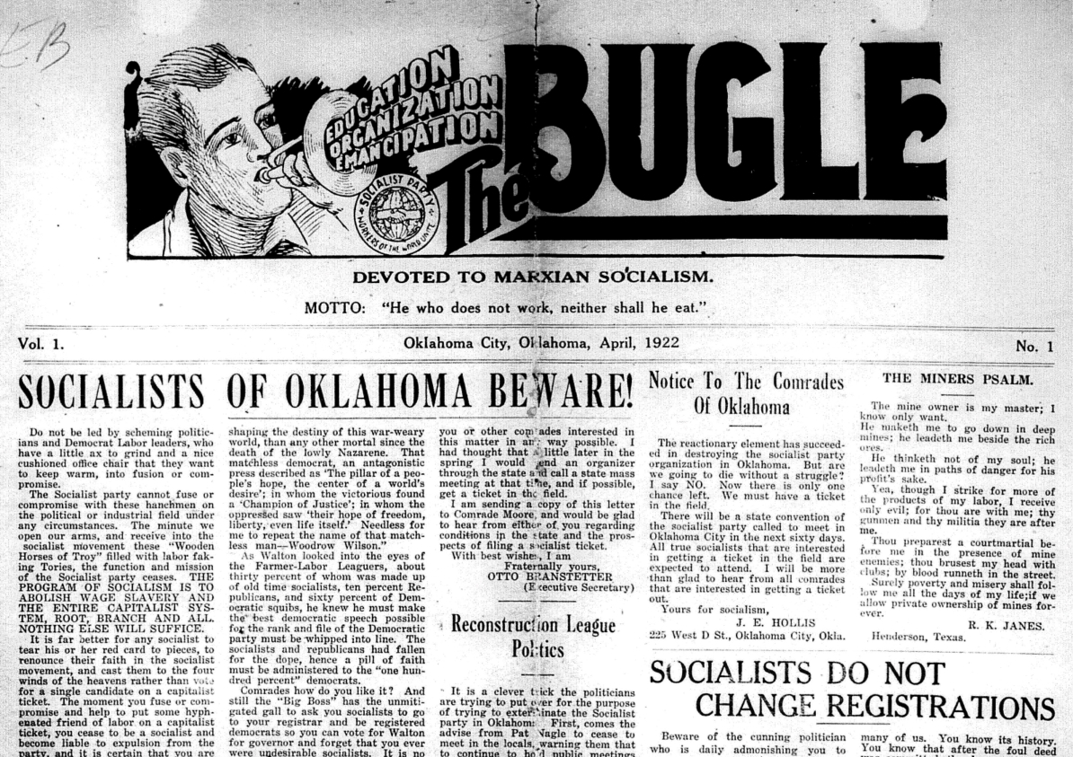 The Bugle was a newspaper published in Oklahoma City between 1922 and 1924 by E.H.H. Gates in an attempt to revive the once-mighty Socialist Party of America in Oklahoma after 1916’s “Green Corn Rebellion,” Debs’ imprisonment, and the reactionary wave following US entry into World War One decimated the party in the state. Only eight issues are known to survive, the effort being unsuccessful. Aligning with the remaining left in the S.P., The Bugle’s masthead read ‘Devoted to Marxian Socialism- He Who Does Not Work, Neither Shall He Eat.’