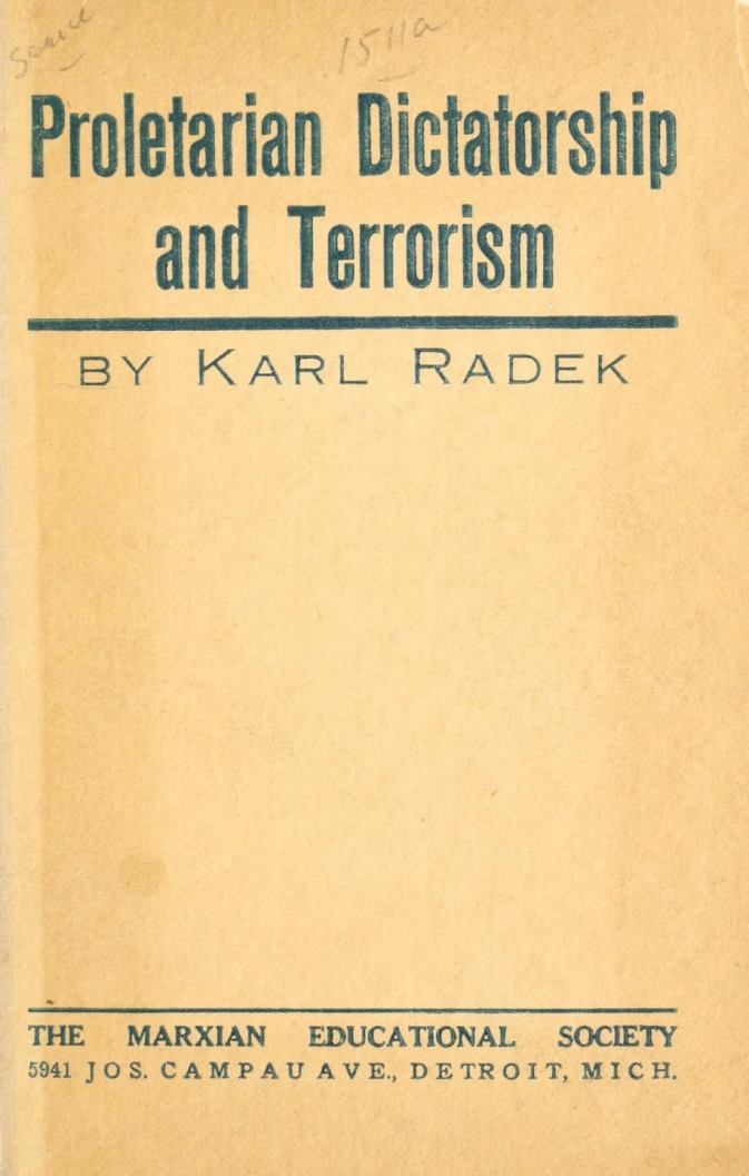 Proletarian Dictatorship and Terrorism by Karl Radek. Translated by Patrick Lavin. Published by the Marxian Educational Society, Detroit. 1921.