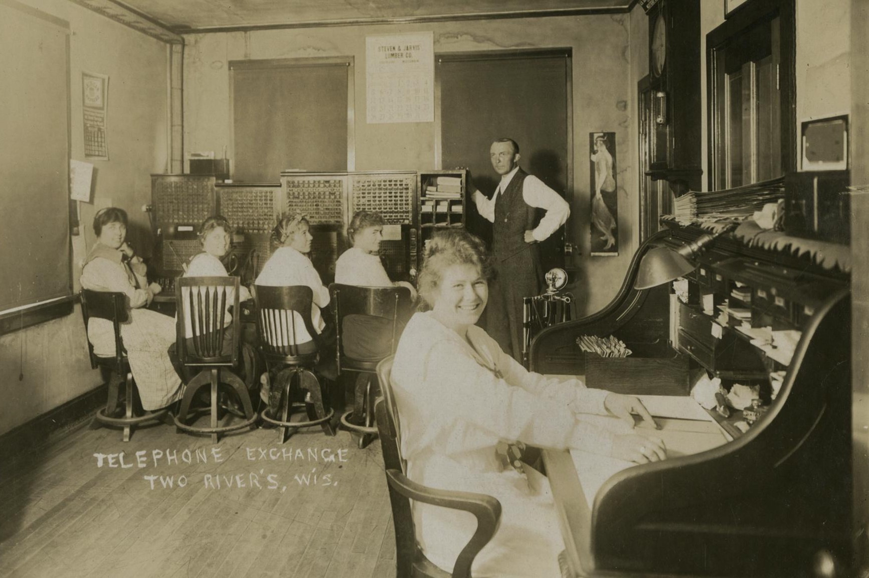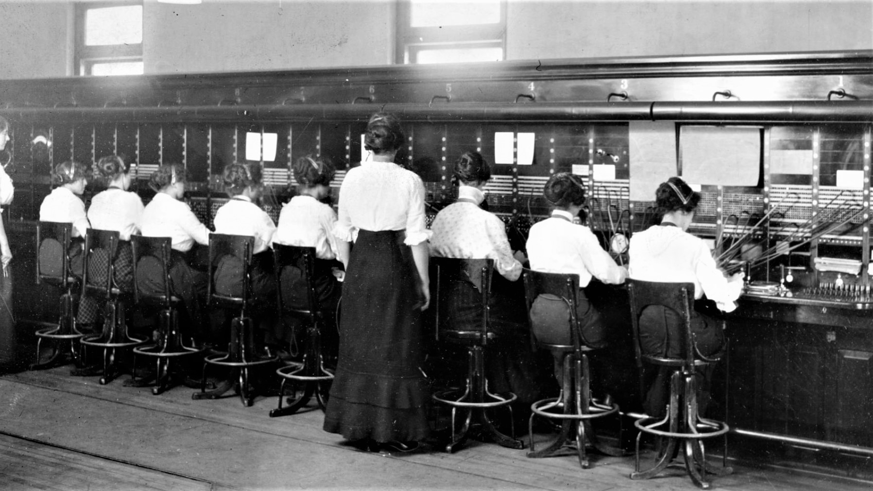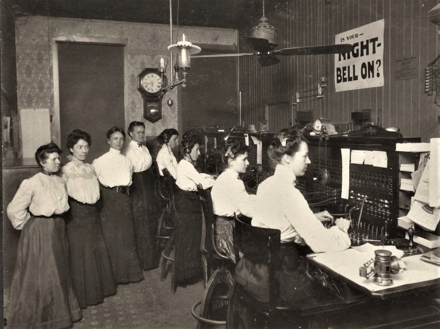 Let us pause a moment here to let the public see slightly more of their — than the posts set by “common laborers,” yet a part of our industry whose wages are low (but perhaps three times our own!)—or the wires put up by the line man, or his telephone installed by the “company’’—Let this public, whose pulsating arteries are controlled by us, see us in our chairs, elbow to elbow, in front of our various “positions” able to reach some 8 or 9 thousand numbers (by reaching our farthest!) staring at the board full of 1/4 inch round holes in panels of 100 each. If one of us becomes extra proficient let the “company’s” subscribers see the supervisor who paces up and down behind each 12 (or so) girls—and observe that supervisor place that proficient operator with an empty board on one side and a new or “green” operator just learning on the other side. Thus a price is paid by the proficient, who is placed in such a position that she is rushed as much as a new beginner.