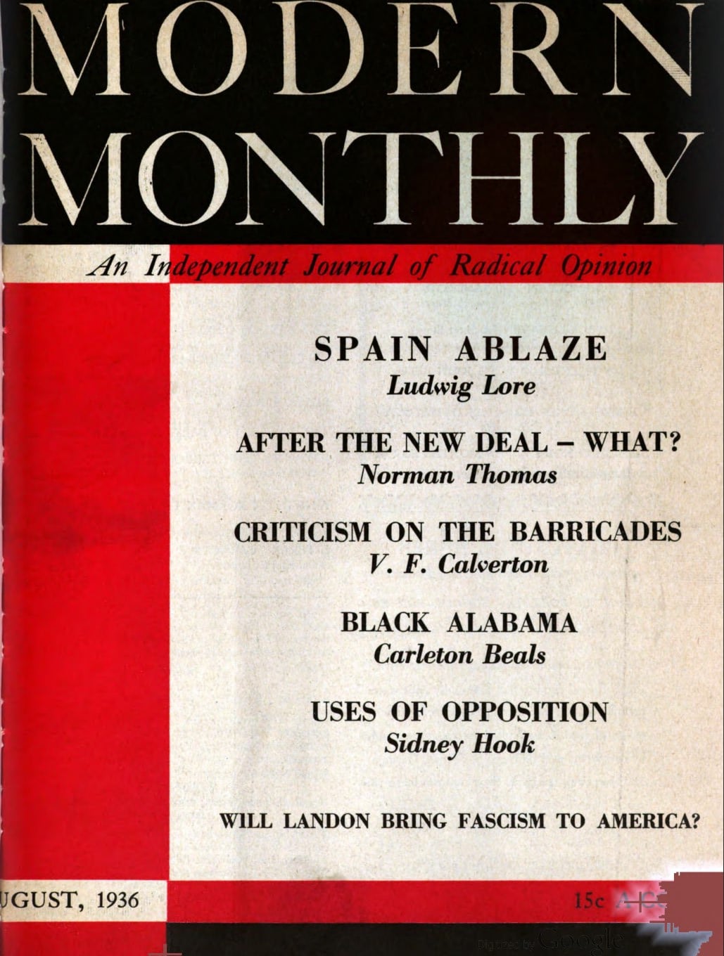 Contents: Editorial: Will Landon Bring Fascism to America?, Spain Ablaze by Ludwig Lore, Why Churches Burn In Spain by VIincenzo Vacira, The Dead Liebknecht by Rudolph Leohard, After the New Deal – What? by Norman Thomas, The Uses Of Opposition by Sidney Hook, Criticism on the Barricades by V.F. Calverton, Black Alabama by Carleton Beals, The Tragedy of Pabst by Herman G. Weinberg, Johann Most: Terrorist of the Word by Max Nomad, A Note on Norman Thomas by Samuel Romer, Literary Caravan.