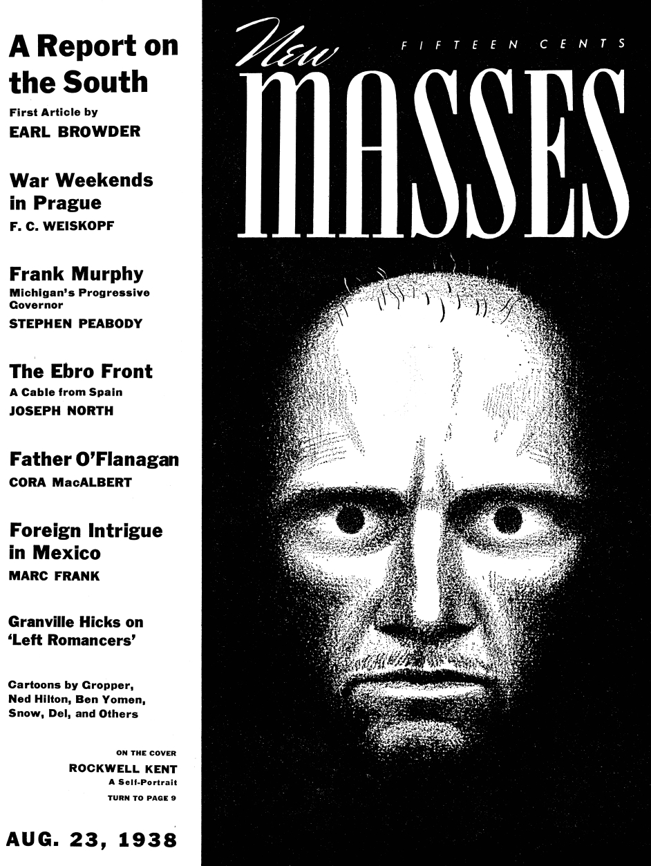Contents: An Historic Report on the South by Earl Browder, War Weekends in Prague by J. C. Weiskopf, Murphy of Michigan by Stephen Peabody, Artists: Unite! by Rockwell Kent, Editorial Comment, Keeping the Bulls Busy by Joseph North, Father Michael O’Flanagan by Cora MacAlbert, Coney Fourth by Marshall Schacht, The Ruling Passion, Barcelona Book Fair, Foreign Intrigue in Mexico by Marc Frank, Franklin and the Jews, Readers’ Forum, Romancers of the Left by Granville Hicks, British Symposium by V. J. McGill, Work Relief Program by William Spencer, Odyssey of the Jews by Joseph Frank, Analysis of Race Prejudice by Bernhard J. Stern, Meditation on Ancestry by Robert Bhain Campbell, Movies by James Dugan, Art by Rockwell Kent (cover), C. Bean, Del, Ned Hilton, Snow, Beck, Bertrando Vallotton, John Stenvall, Julio de Diego, Ad Reinhardt, Malman, Tom Funk, Beatrice Tobias, Lynd Ward.