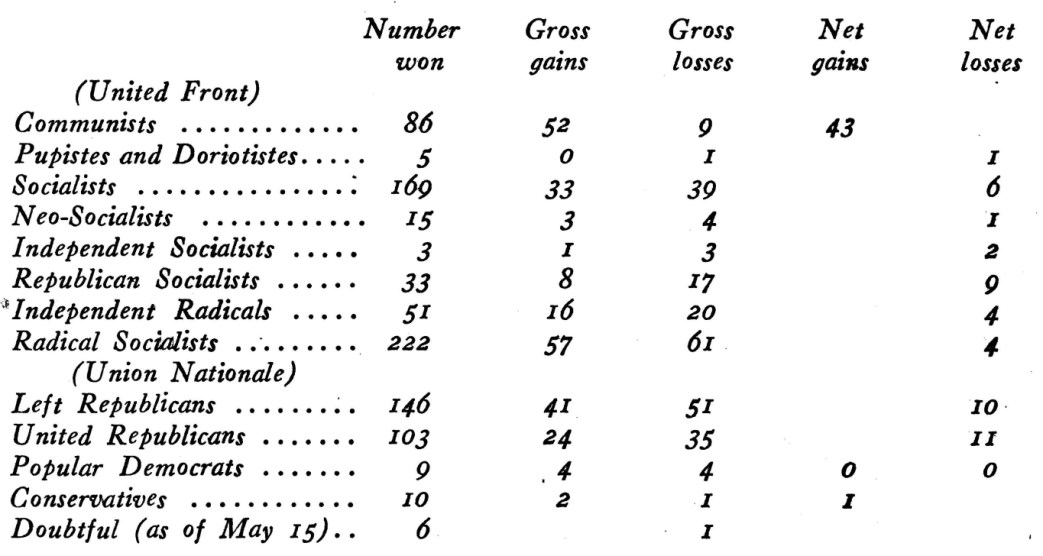(NOTE FROM NEW MASSES EDITOR. For weeks the papers have carried news of financial crisis in France and the toppling of cabinets. Laval emerges with semi-dictatorial powers aimed at saving the country from financial collapse. The real factor behind the insecurity of French politicians is the united front called the “Front Populaire,” which won sweeping electoral victories for the workers on May 12. Formed last year on the initiative of the Communist Party of France, the “Front Populaire” has united under the anti-fascist banner the Socialist and Communist Parties, the Pupistes (Communist Opposition), some Independent Radicals and Republican Socialists and some Radical Socialists and other groups. In less than a year it has changed the current of political history in France. The results of the recent elections, sent to us by a correspondent in Paris may be summarized as follows: Three factors stand out: (1) The progress made by the Communist Party; (2) The success of the united front against fascism; and (3) the election of Prof. Rivet, one of France’s outstanding intellectual leaders and chairman of the Intellectuals’ Vigilance Committee Against Fascism. Consulting the official tables which we reproduce below, giving results for 858 communes of over 5,000 inhabitants each, the reader will observe that the Communist Party made net gains of exactly 100 percent. But these tables do not tell the whole story. No distinction is made between the larger and smaller communes of over 5,000. They do not indicate that the Party gained Colombes (57,000), Velleurbanne (65,000) and a number of other cities of importance; nor that the nine “losses” of the Party did not include suck outstanding places as Argenteuil (70,600). A gain, the statistics do not show the great progress made by the Communists in towns of less than 5,000 and Paris itself. Before the elections there was one Communist on the Paris municipal council. There are now eight. Although this is less than 10 percent of the total Council (90), the Party polled 20 percent of the Paris votes. The electoral system of Paris is notoriously undemocratic; less than 45 percent of the voters elected the reactionary councillors forming 60 percent of the body. Finally in the Paris region (including the city and its suburbs) with nearly 5,000,000 inhabitants, the Communist Party emerged as the strongest single party. It polled 235,000 votes there, or 30 percent of the total of 760,000. Before the elections it controlled nine suburban municipalities. Today it will administer twenty seven, comprising more than a third of the suburban population; and the united antifascist front won fifty-five suburban municipalities forming a “Red Belt” around Paris. Opposed to the “Front Populaire” was the bloc of Right parties forming the “Union Nationale,” all basically fascist. Had the “Front Populaire” kept the “Union Nationale”. from advancing it would have been a victory. But the united front accomplished far more; it imposed positive losses on its adversaries. It achieved positive gains for itself. We publish below an analysis of the fundamental issues behind the election results, by one of the leading French political writers of the Left.)