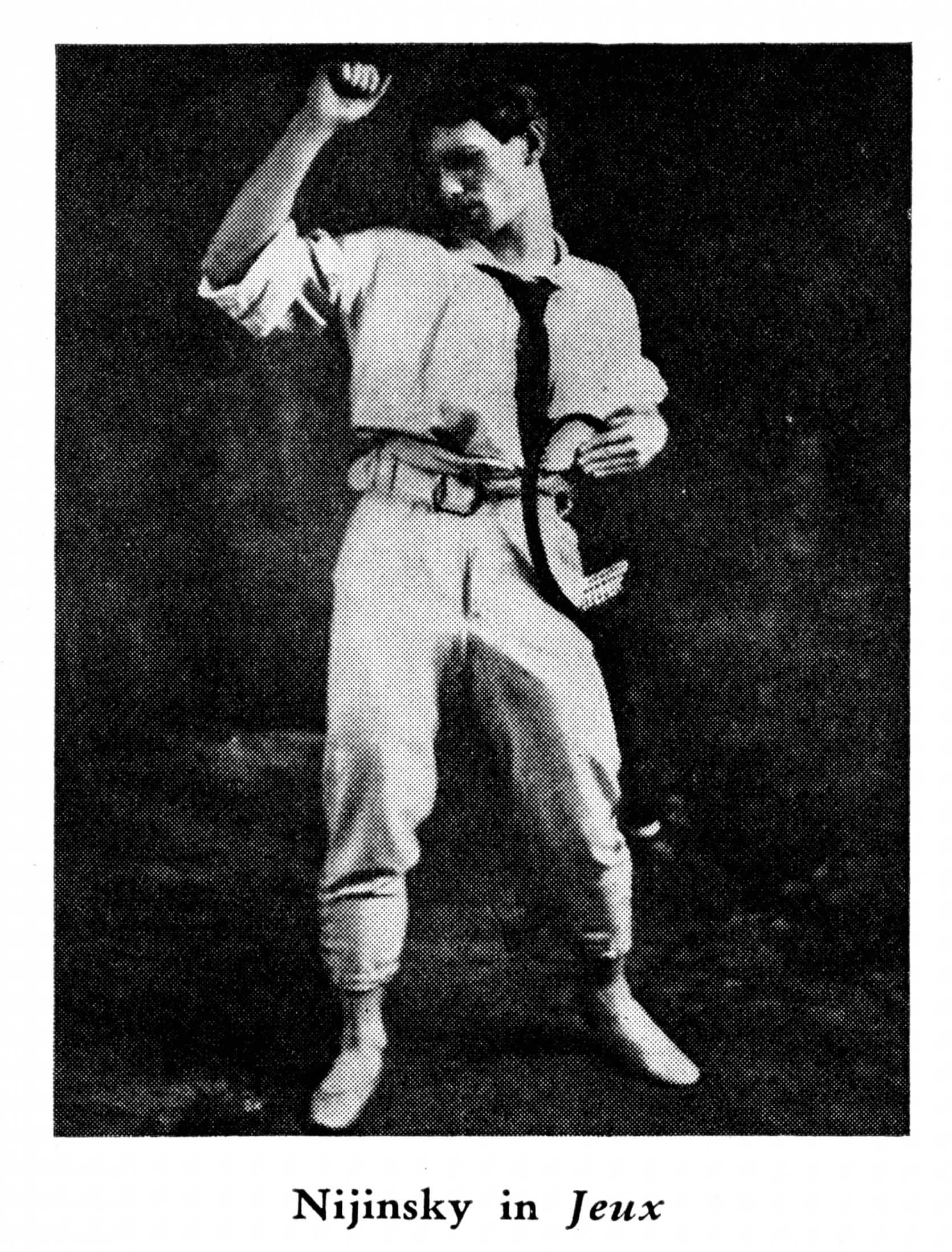 Nijinsky was the immediate and given cause of Fokine’s resignation from the Russian Ballet, and in spite of his tragic, unachieved career, it is difficult not to consider him as the single greatest genius of dancing in modern times. Superlative as a classic dancer, before he was twenty-five he reversed classic dancing and established a new species of synthesized movement which has been the virtual source of modernisms ever since. Nijinsky could not support dancing as mere divertissement or attractive amusement for its own sake. In Faun; he composed a complete lyric incident in fluid movement, at one blow destroying the atrophied idea of Greece as Phidian Greece, and with the recreation of the monumental archaic, suggested the creation of a simple, direct and profoundly felt modernism which was articulated in greater elaboration in the nationalist, pre-archeological Rites of Spring, and realized, in small, in Jeux- never to be realized largely in the unproduced but magnificently indicated formal dances for the music of Bach’s Preludes and Fugues. Nijinsky hoped for dancing as an expression of human action as intense and direct as possible; unhampered by a precedent, the legible objectification in terms of kinetic essences of the whole nature of human activity. Towards ritual, he proposed a mass dance drama, more important in scope and intention than any spectacle since the Greek ritual tragedy of the Bacchae. Nijinsky’s great contributions to dance-composition have not yet been realized, in the excess of emphasis on his own hideous personal disaster. Some inkling of his ideas may be gained from his wife’s biography, but only by inference.