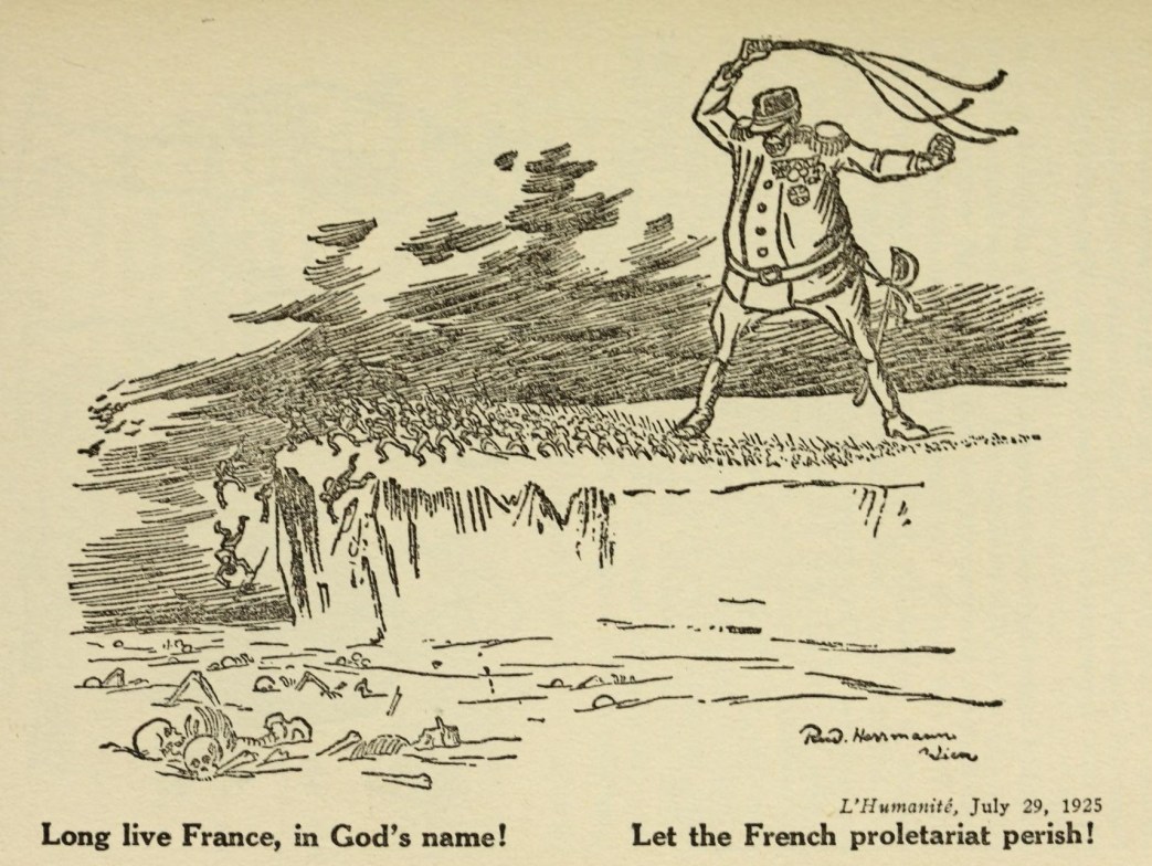 The French workers who organized the campaign against the Moroccan War of 1925 decided to fight the economic system primarily and the war only incidentally. Their campaign was not so much a campaign against war as it was a campaign against bankers, profiteers and concessionaires whose activities make war inevitable.