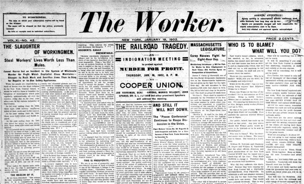 The Worker, and its predecessor The People, emerged from the 1899 split in the Socialist Labor Party of America led by Henry Slobodin and Morris Hillquit, who published their own edition of the SLP’s paper in Springfield, Massachusetts. Their ‘The People’ had the same banner, format, and numbering as their rival De Leon’s. The new group emerged as the Social Democratic Party and with a Chicago group of the same name these two Social Democratic Parties would become the Socialist Party of America at a 1901 conference. That same year the paper’s name was changed from The People to The Worker with publishing moved to New York City. The Worker continued as a weekly until December 1908 when it was folded into the socialist daily, The New York Call.