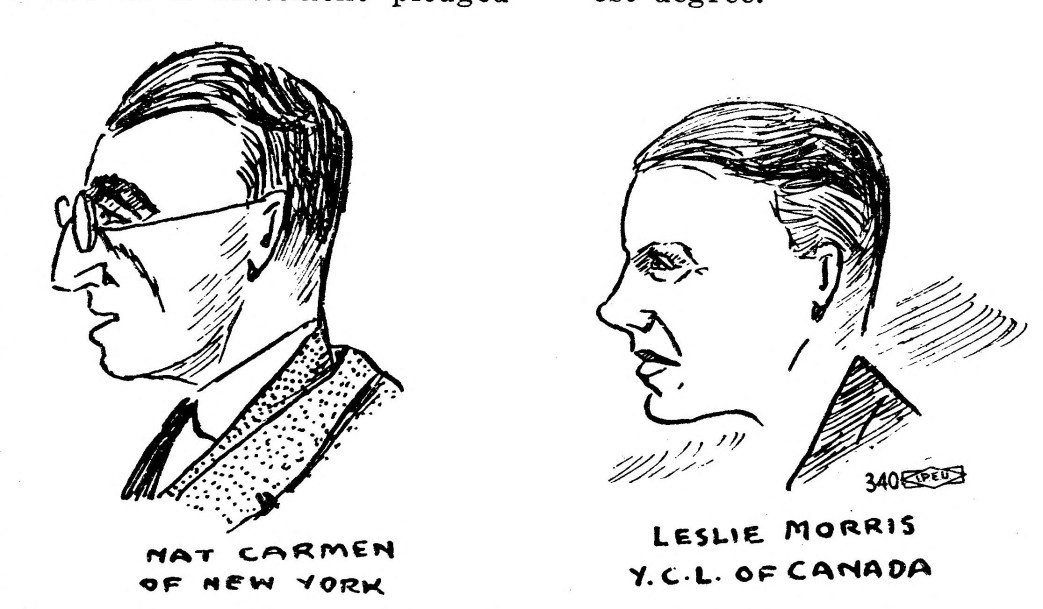 The national executive committee of the Canadian Young Communist League is beginning its great campaign of activity. Many important decisions were made during the last session of that body, Leslie Morris, secretary of the League ,is to go on tour thru Ontario to organize new branches; another organizer is to be sent in the near future to organize nuclei in the mining towns, where prospects are extent for communist work, the miners being among the most radical in the industry, and that yet another organizer be sent out West as soon as possible. A youth paper is to be started soon, thus giving the Canadian league its own organ. For all these things finances are needed and so the members are being urged to give a day’s wage on November 7th, the anniversary of the Soviet Republic. If the league had more finances, the opportunities for a splendid growth would be realized in short order. In spite of all the difficulties, such as finances, youth of the organization, vastness of the territory to be covered, and so forth, the league is continuing to grow rapidly. Junior Groups being organized in many cities, educational activity is being increase and the organization of shop nuclei is being started in the larger cities.