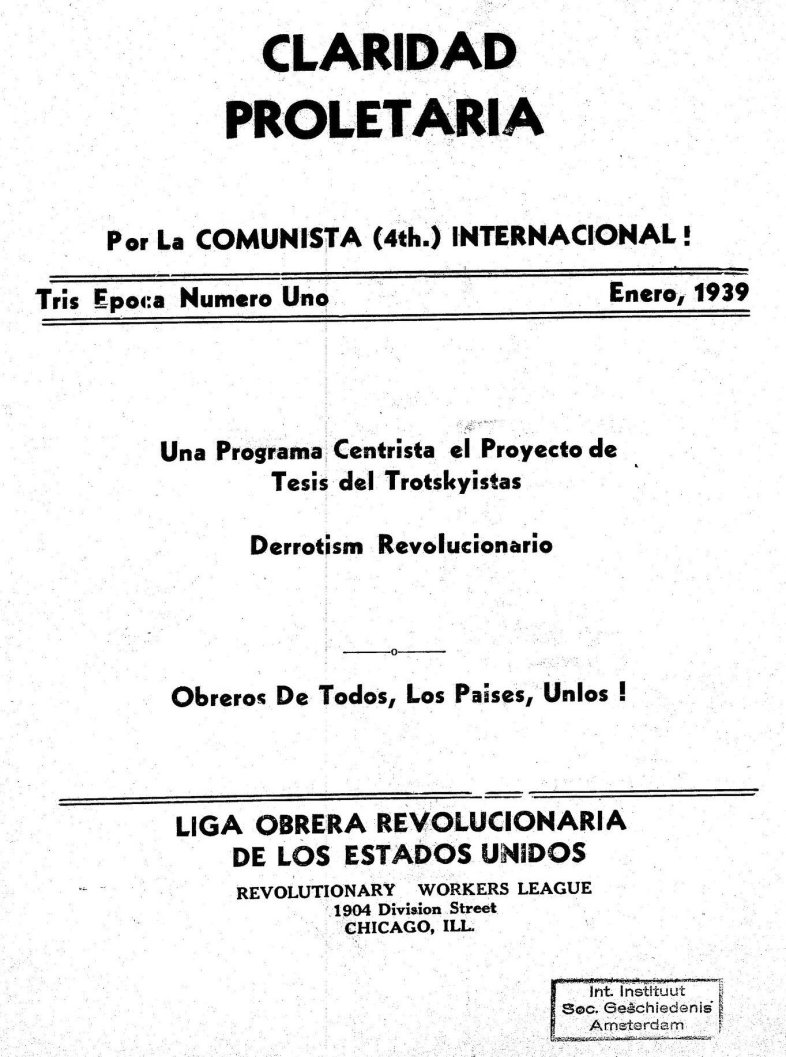 Claridad Proletaria was the Revolutionary Workers League’s Spanish-language journal published irregularly from 1936 to 1939. When the Stamm group split in 1938 to form a rival RWL, they also published this version of ‘Claridad Proletaria,’ also until 1938, and edited by Rosalio Negrete. If ever in doubt, the Stamm RWL published under ‘Demos Press’ in Detroit sometimes called the RWL-Revolt, while the Oehler RWL published in Chicago retained ‘Fighting Worker.’ And then there were the later 1940s splits from these two groups, but that is beyond the scope of the Newsstand.