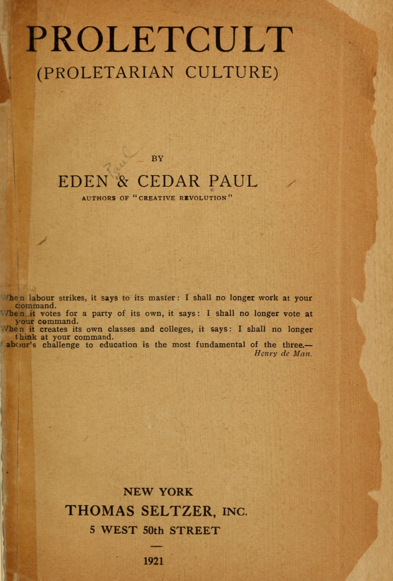 Proletcult (Proletarian Culture) by Eden and Cedar Paul. Thomas Seltzer Publishers, New York. 1921.