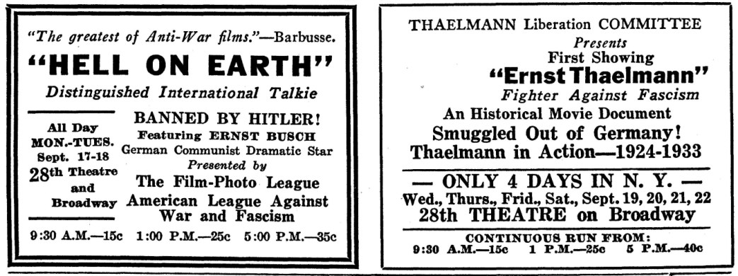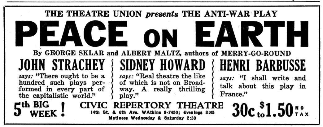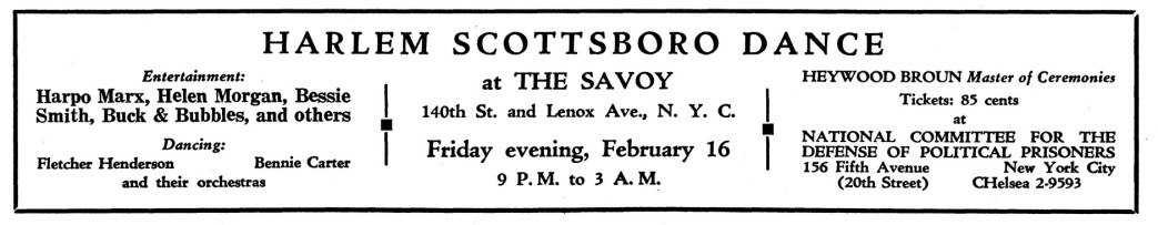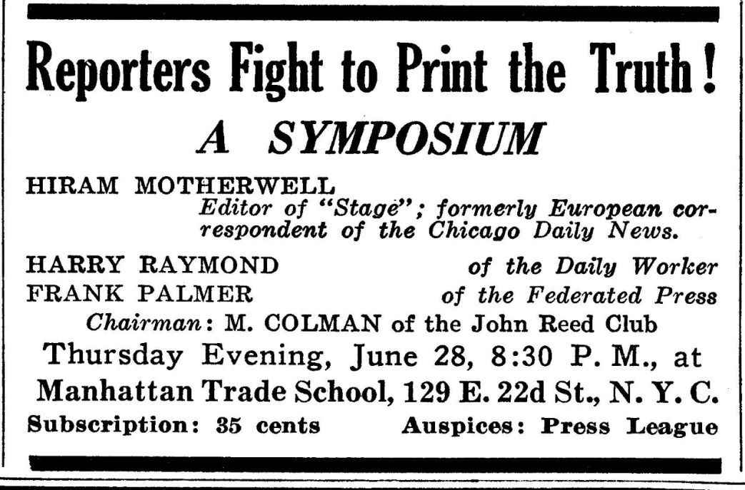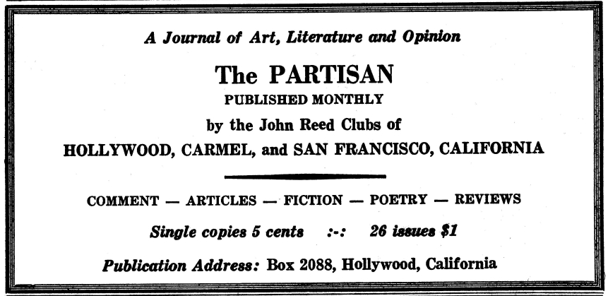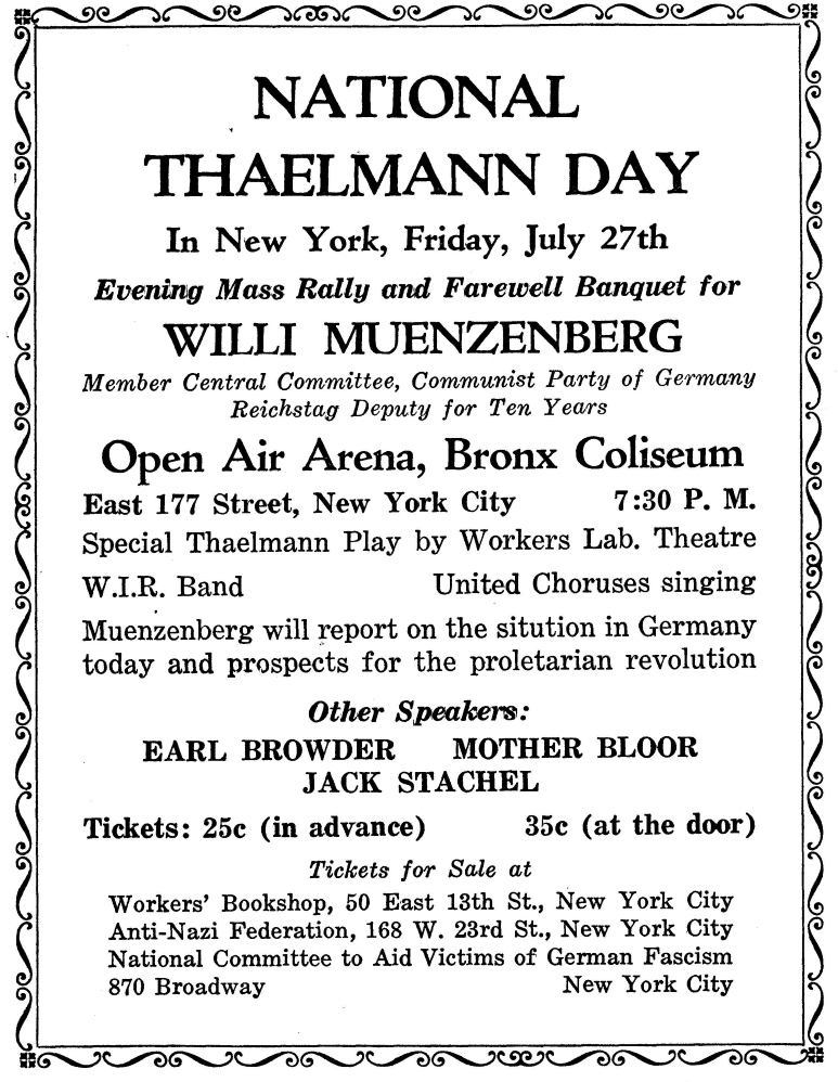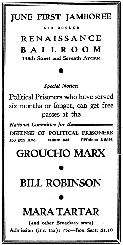 An almost overwhelming sampling of leftist cultural events in New York City published by the New Masses for the year 1934. Over 120 announcements covering theater, puppetry, camps, proletarian literature, art, photography, dance, music, films, poetry, song, political forums, retreats, frolics, recitals, cruises, benefits, celebrations, banquets, debates, protests, and much more.