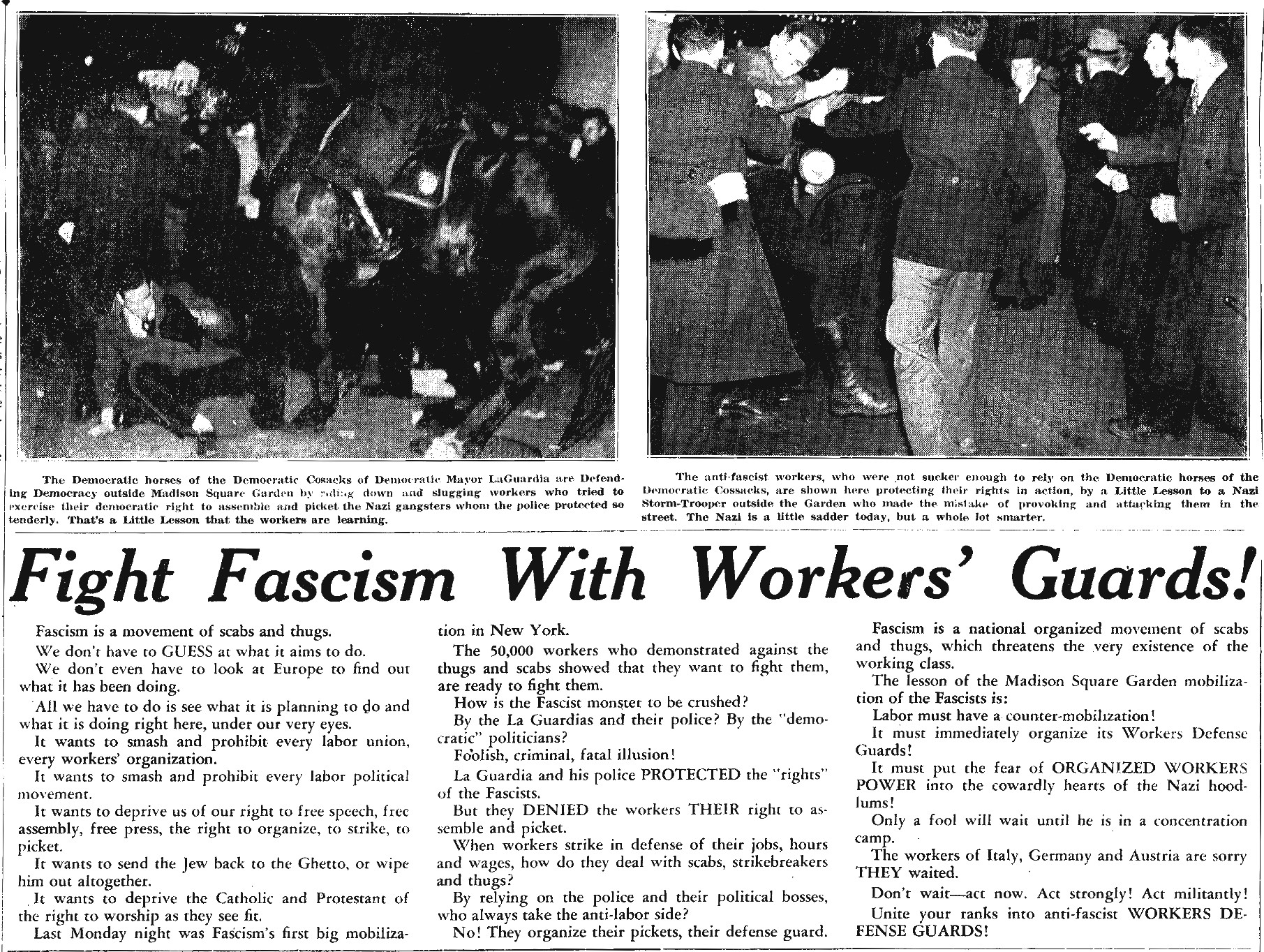 (9) Using its knowledge of the plans of the enemy, the guard will attempt to contact the organizations in its neighborhood, with whom it presumably has established close fraternal connections, in order to gain the support of these organizations for mass actions in defense of the democratic rights of labor, etc., to be conducted against the Coughlinites. The guard becomes thus not only an organization of propaganda and agitation, but also an organization of action. It must be understood, however, that we always carry on our actions on the basis of our ability to mobilize larger masses behind our aims and moves than simply the members of the guard nucleus or even of the party membership.
