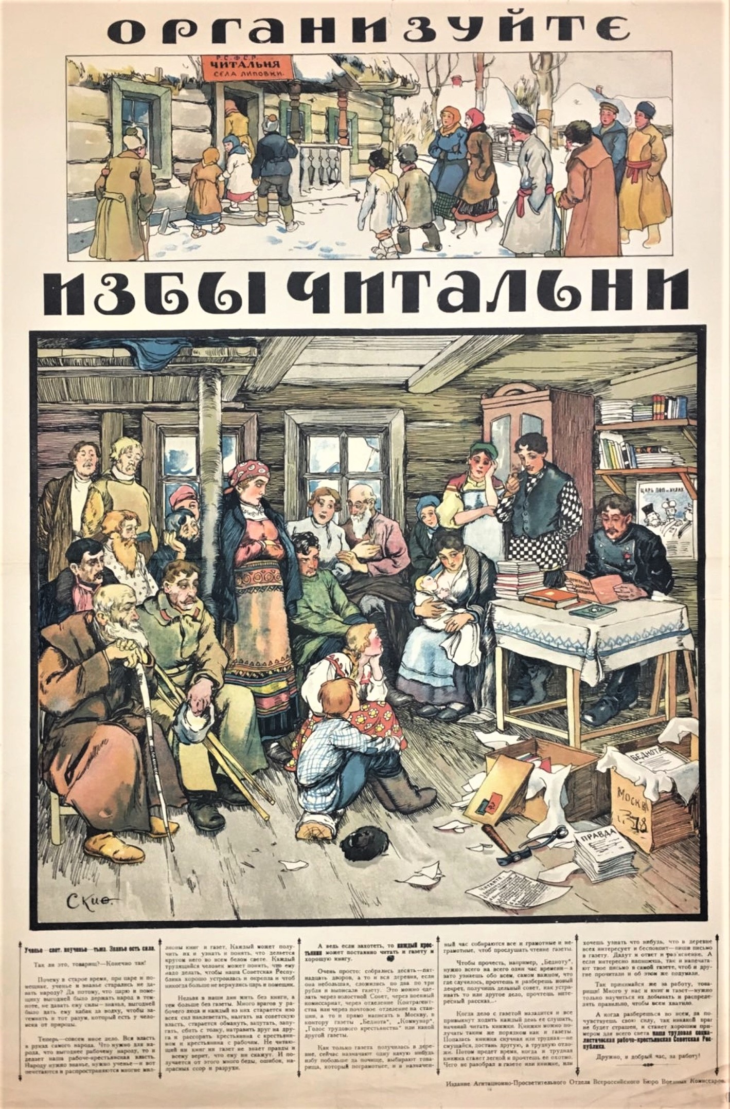 I shall mention another important step. In the first place, we have just now been entrusted with the food campaign. We ourselves offered to carry on this campaign by means of placards, theatrical performances, literature, and agitation of a scientific character. We threw our extra-mural and school forces into the mass of the peasantry, and have thus helped the Commissariat of Food in its struggle for the grain quotas. We have achieved a number of concrete results in this respect. But one of the most pleasant results is the fact that we now have textbooks which will be a great help in the work of training agitators. With the aid of the Central Committee of the Party a book of 200 pages was written, set in type, put on the press and printed — all in eight days. This shows what we can do if we but will it.