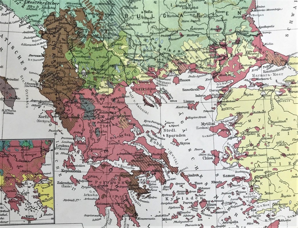 1. Greece, which belonged to the Balkan Coalition formed against the Turks, obtained, after the war of 1912 and 1913, territory peopled by other nationalities (Macedonia, Epirus and the Aegean islands). Her participation in the European war also obtained for her a part of Thrace which is peopled by a great number of non-Greekish elements. The heterogeneous elements of Greece belong to different Balkan nationalities. There are Turks, Bulgarians, Jews, Albanians, Armenians and Roumanians. Turks are the most numerous and at present inhabit all the regions of New Greece (acquired since 1912). Then come the Bulgarians, dwelling in Macedonia and in Thrace. The Roumanians inhabit the south-west of Macedonia, the Albanians Epirus, while the Jews and the Armenians are scattered about in the towns of New Greece.