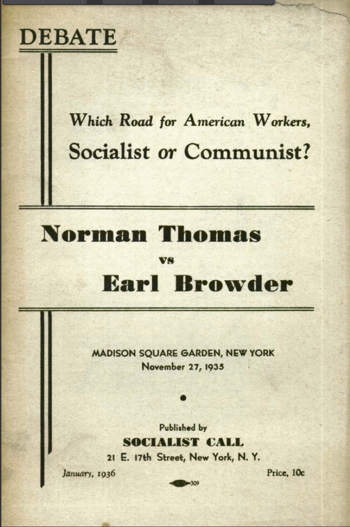 Which Road for American Workers, Socialist or Communist? Norman Thomas vs Earl Browder. Published by Socialist Call, New York. January, 1936.
