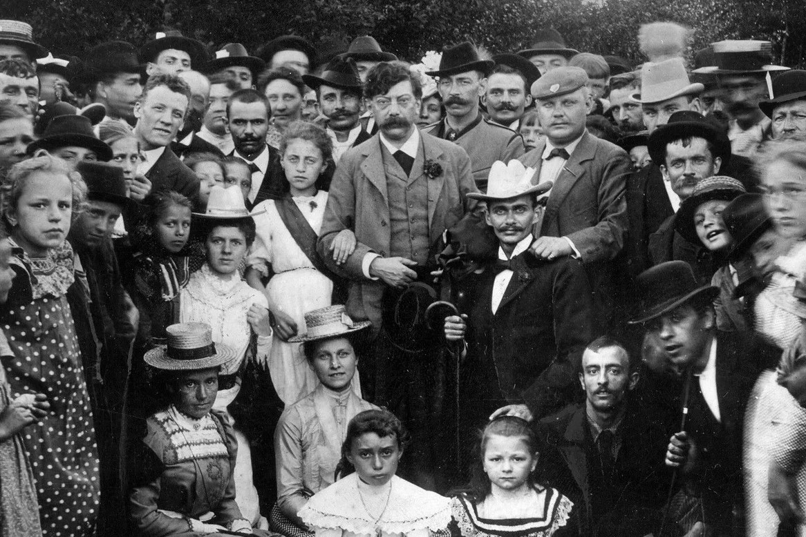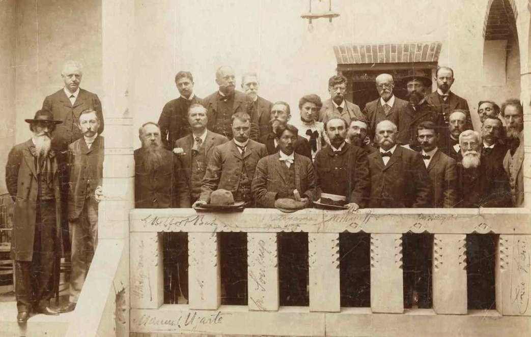 Along with Adler and Plekhanov, Daniel De Leon observes Karl Kautsy, Sen Katayama, Rosa Luxemburg, Clara Zetkin, August Bebel, Emile Vandervelde, and Henri van Koll at the Socialist International’s 1904 Amsterdam Congress.