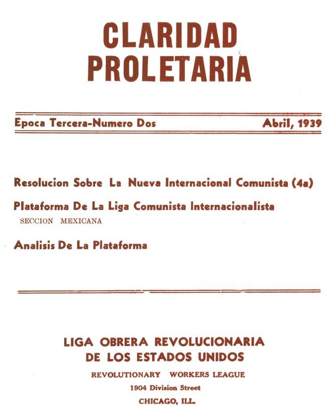 Claridad Proletaria was the Revolutionary Workers League’s Spanish-language journal published irregularly from 1936 to 1939. When the Stamm group split in 1938 to form a rival RWL, they also published this version of ‘Claridad Proletaria,’ also until 1938, and edited by Rosalio Negrete. If ever in doubt, the Stamm RWL published under ‘Demos Press’ in Detroit sometimes called the RWL-Revolt, while the Oehler RWL published in Chicago retained ‘Fighting Worker.’ And then there were the later 1940s splits from these two groups, but that is beyond the scope of the Newsstand.
