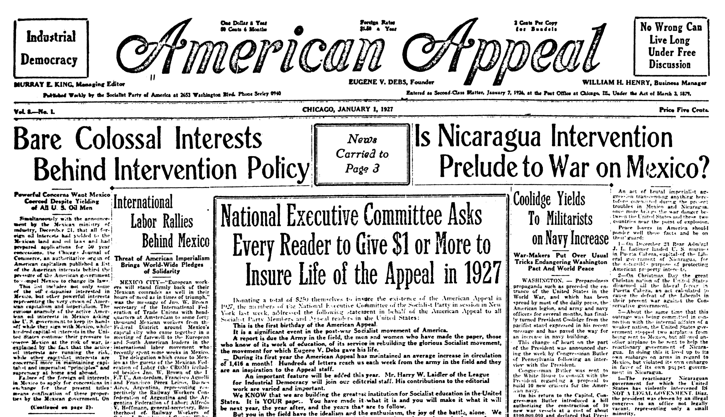 American Appeal was a newspaper nominally edited by Eugene V. Debs that served as a semi-official organ of the Socialist Party of America in the 1920s. Published weekly out of Chicago, American Appeal took over for the The Socialist World in 1925, also published by the SPA and ‘edited’ by Debs with Murray King as Managing Editor.