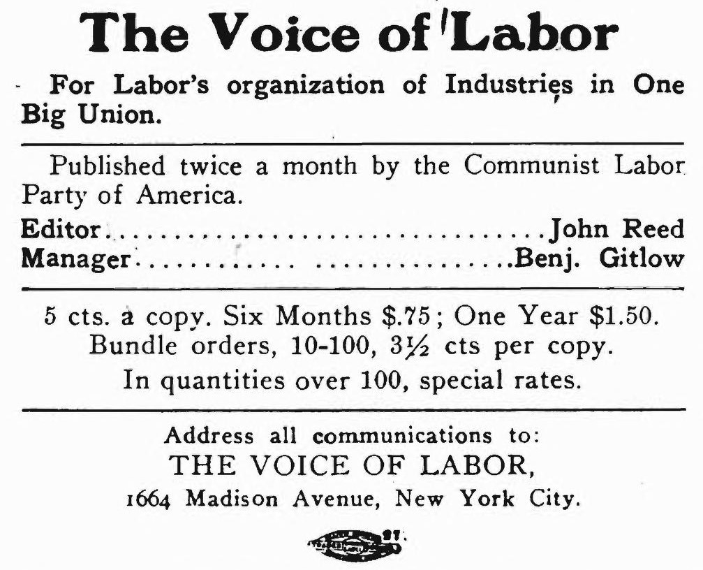 The issuing of an official paper, a fighting organ for the party, was next debated. The need for such a periodical was apparent to all committeemen, in fact, the demand by the membership for an official national paper was imperative. After going into detail as to the successful financing of such a paper, a motion was passed to publish a bi-weekly under the direct control of the National Executive Committee of the party. At a subsequent session Max Bedacht was elected editor and the new periodical was named Communist Labor.