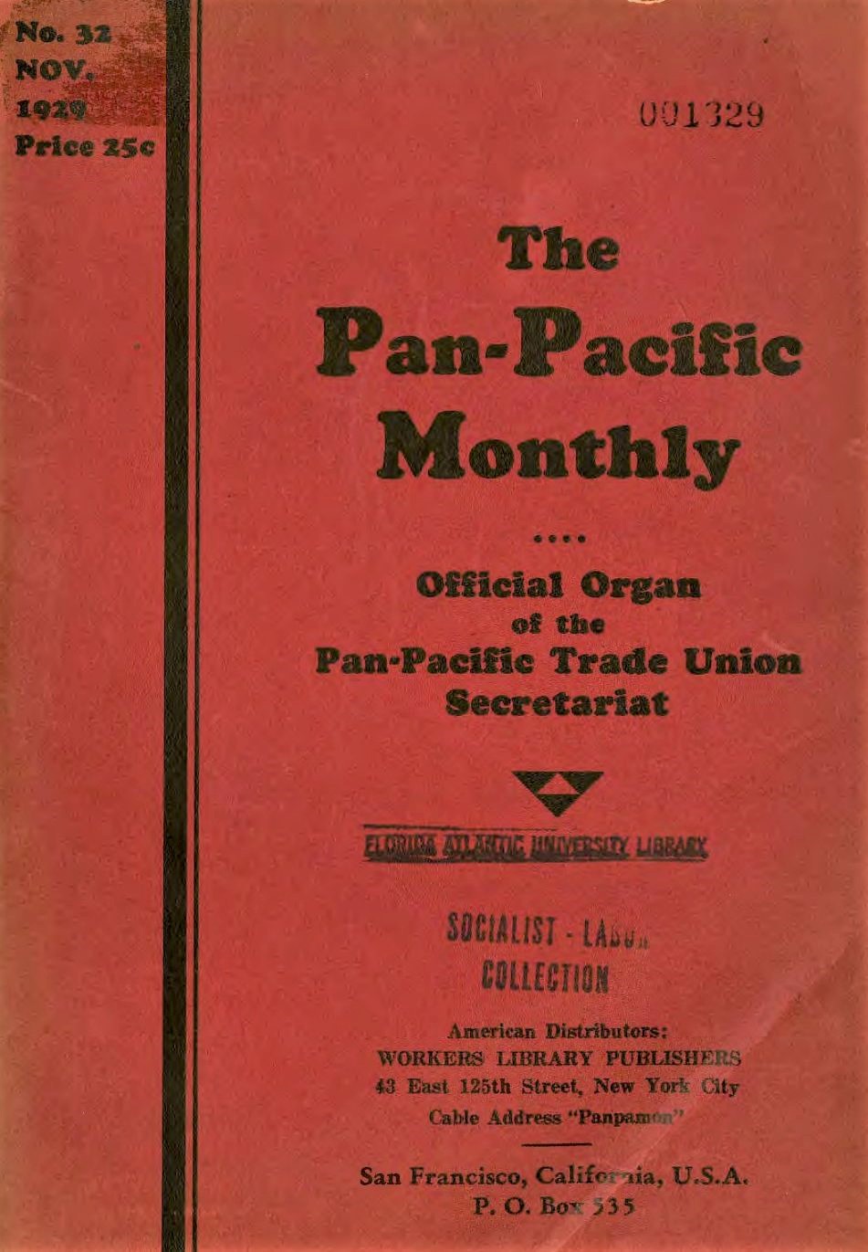 The Pan-Pacific Monthly was the official organ of the Pan-Pacific Trade Union Secretariat (PPTUS), a subdivision of the Red International of Labor Unions, or Profitern. Established first in Ha in May 1927, the PPTUS had to move its offices, and the production of the Monthly to San Francisco after the fall of the Shanghai Commune in 1927. Earl Browder was an early Secretary of tge PPTUS, having been in China during its establishment. Harrison George was the editor of the Monthly. Constituents of the PPTUC included the Australian Council of Trade Unions, the All-China Federation of Trade Unions, the Indonesian Labor Federation, the Japanese Trade Union Council, the National Minority Movement (UK Colonies), the Confédération Générale du Travail Unitaire (French Colonies), the Korean Workers and Peasants Federation, the Philippine Labor Congress, the National Confederation of Farm Laborers and Tenants of the Philippines, the All-Union Central Council of Trade Unions of the Soviet Union, and the Trade Union Educational League of the U.S. With only two international conferences, the second in 1929, the PPTUS never took off as a force capable of coordinating trade union activity in the Pacific Basis, as was its charge. However, despite its short run, the Monthly is an invaluable English-language resource on a crucial period in the Communist movement in the Pacific, the beginnings of the ‘Third Period.’