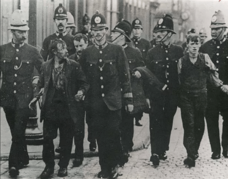 His record as a Liberal minister was an extraordinary one. In November, 1910, he filled the mining valleys of Rhondda, and Aberdare with police who violently broke up meetings of the striking miners, and when the miners protested sent in troops, who fired on the workers at Tonypandy. The following year he used troops as strikebreakers in the railway strike, and also against the dockers of Liverpool. His exploits with the guards in Sydney Street, when three anarchists defied the whole London garrison for a day, made him the laughing stock of the world.