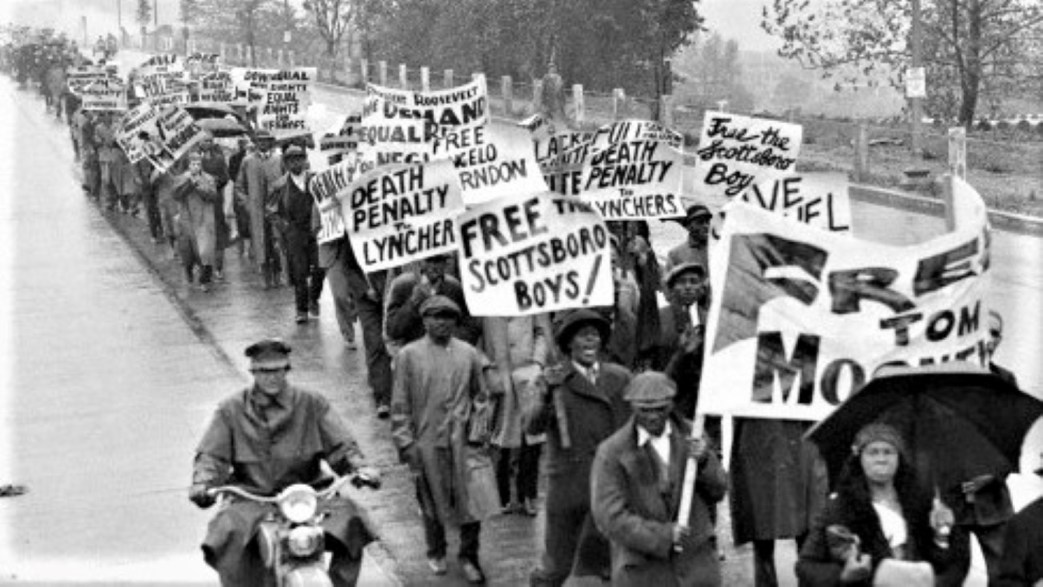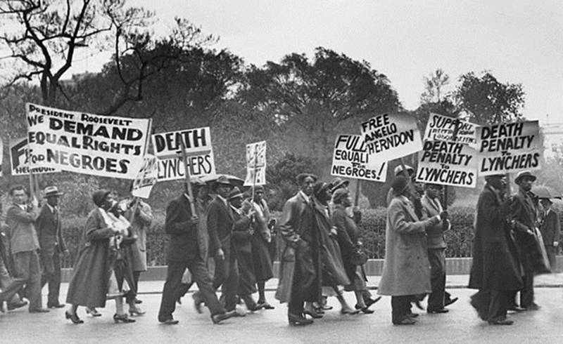 The marchers strode along with determined tread and militant voices demanding “THE RELEASE OF TOM MOONEY AND THE SCOTTSBORO BOYS,” “EQUAL RIGHTS FOR NEGROES,” “UNITY OF BLACK AND WHITE.” No matter that they had travelled for days without sleep, that they had lived on sandwiches and coffee, that the weather was disagreeable. They were making history in the liberation struggles of the Negro people. They were demonstrating the growing unity of black and white workers.