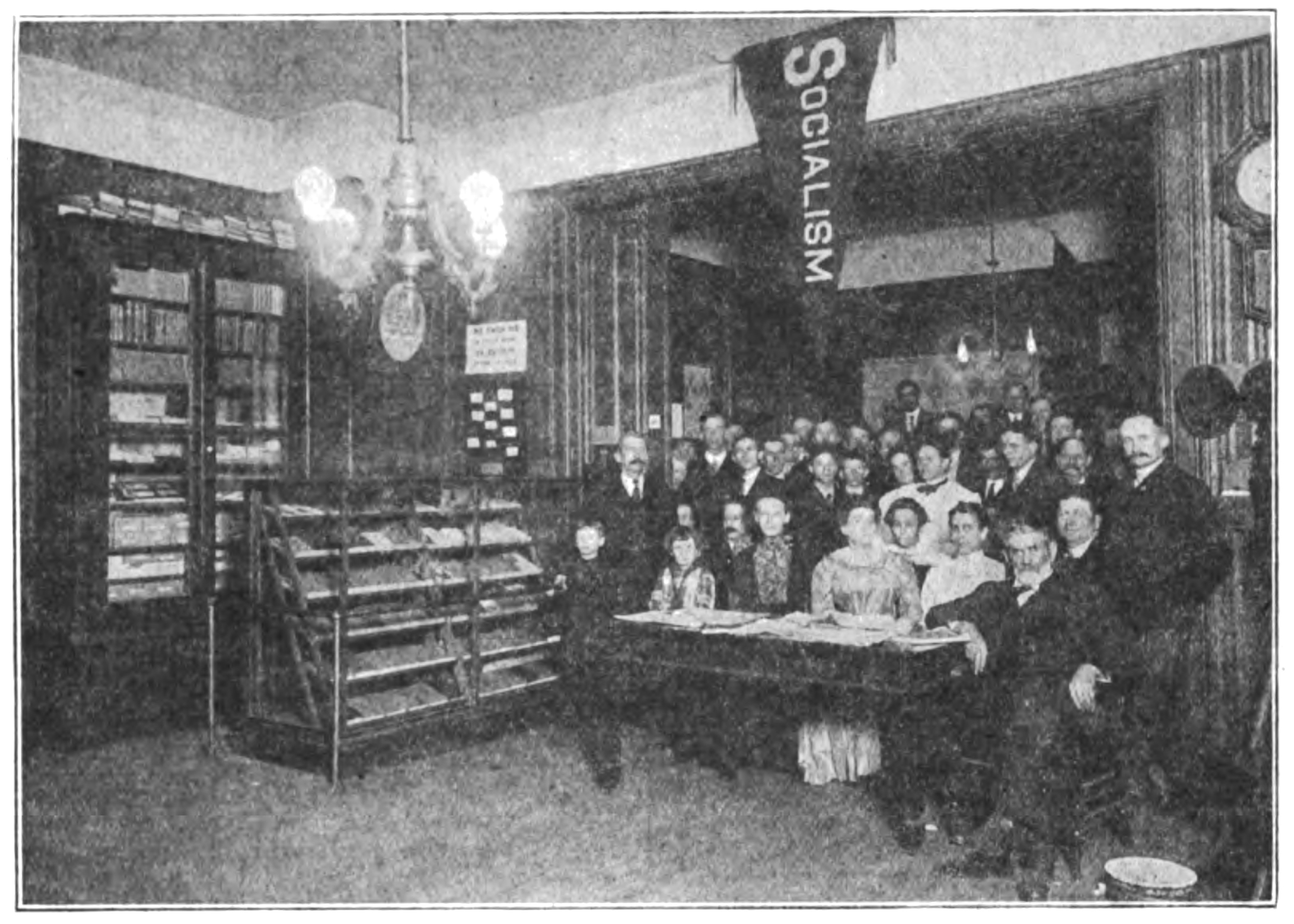 We miss the faces of many of the older comrades who in the early days fought the battles of the young organization when it meant something more than paying dues once a month to be known as a Socialist. However, we recognize Comrade Atkins, sitting at the right of the table, as one of the old guard. He writes, “We now carry about $250.00 worth of books at wholesale, mostly your publication.” And after all is said and done, the most valuable work a Socialist organization can accomplish is the circulation of sound, scientific Socialist literature.