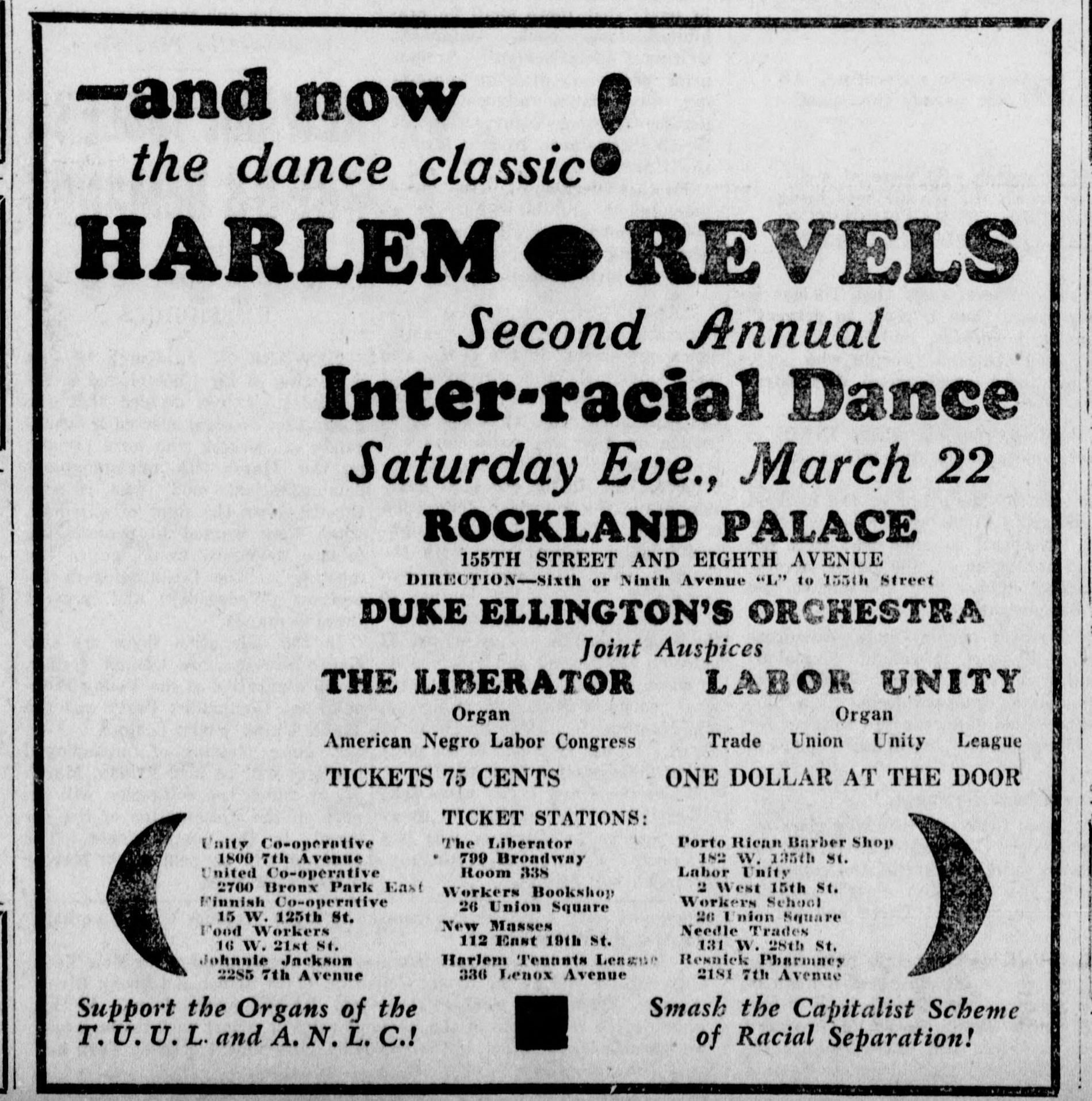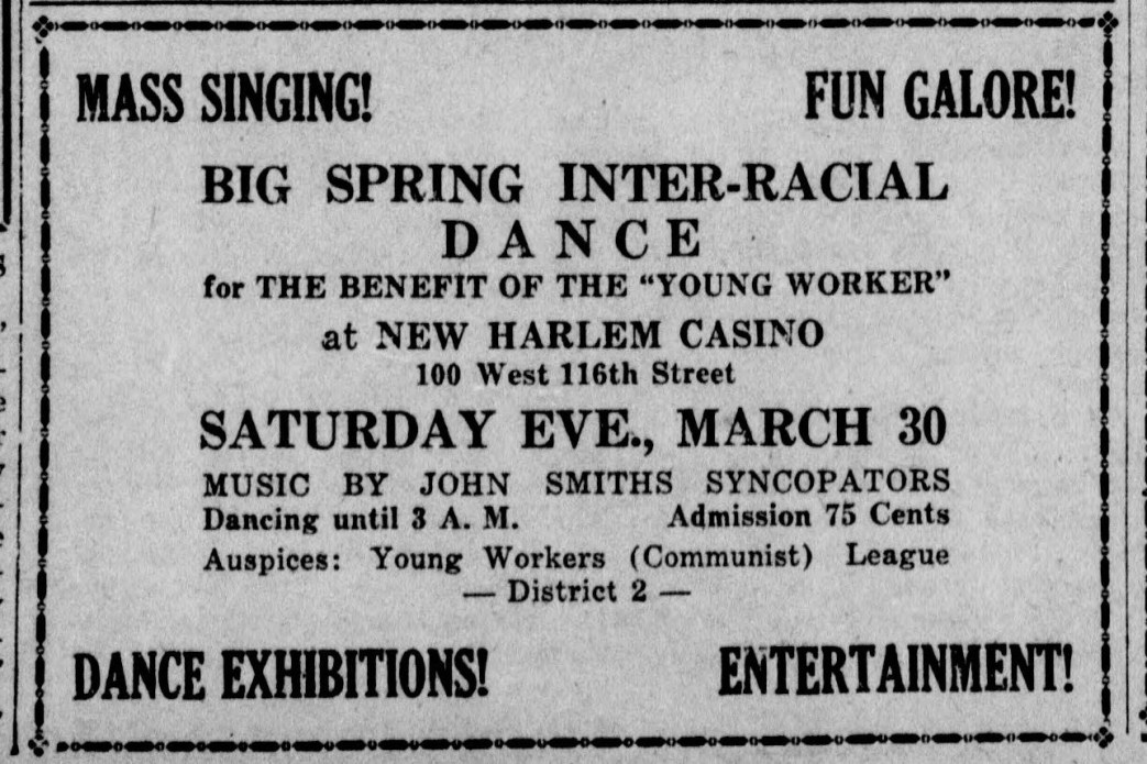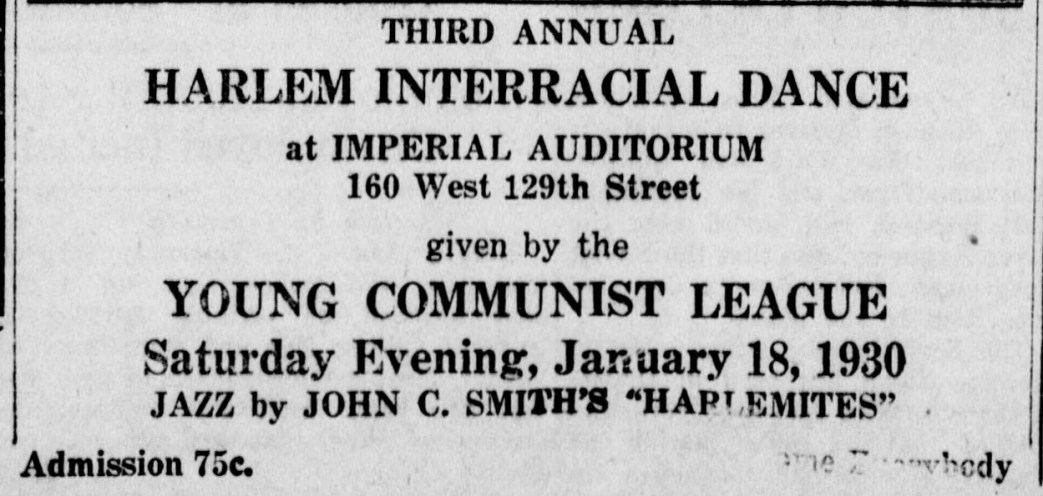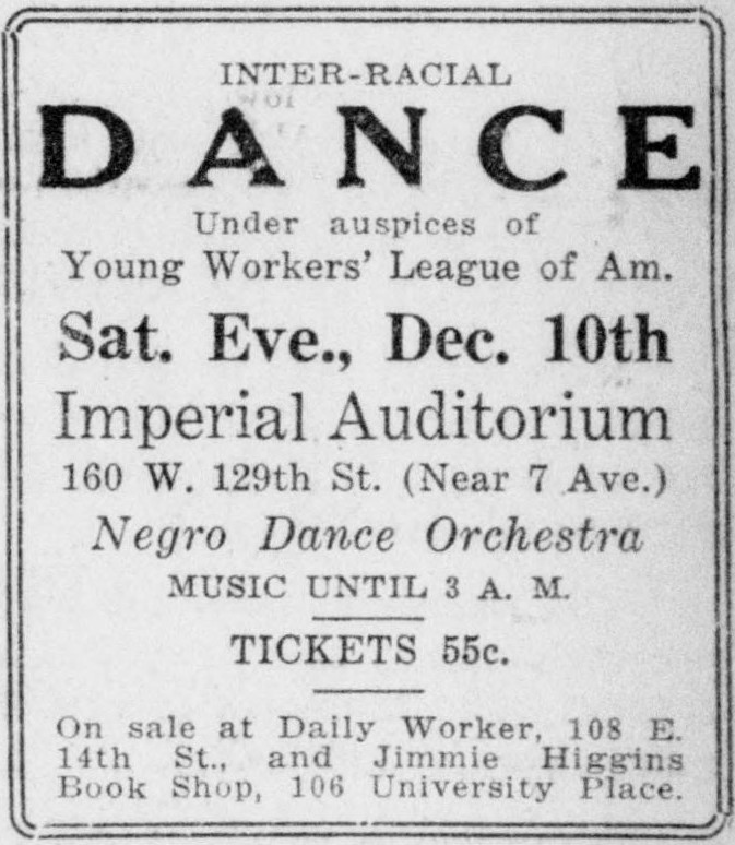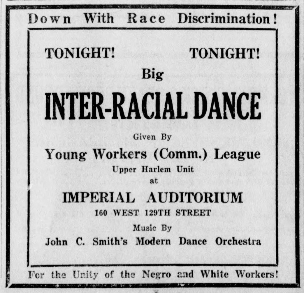 Upper Harlem Youth to Give Inter-Racial Dance This Evening. The Inter-Racial Dance arranged the upper Harlem unit of the Young Workers (Communist) League will be held tonight, beginning early in the evening, at the Imperial Auditorium, 160 W. 129th St. The festivities will continue until dawn on Sunday, with John C. Smith’s Modern Jazz Orchestra supplying the jazz. The dance is part of the campaign the unit is waging for complete social and economic equality for the Negro workers.