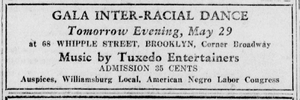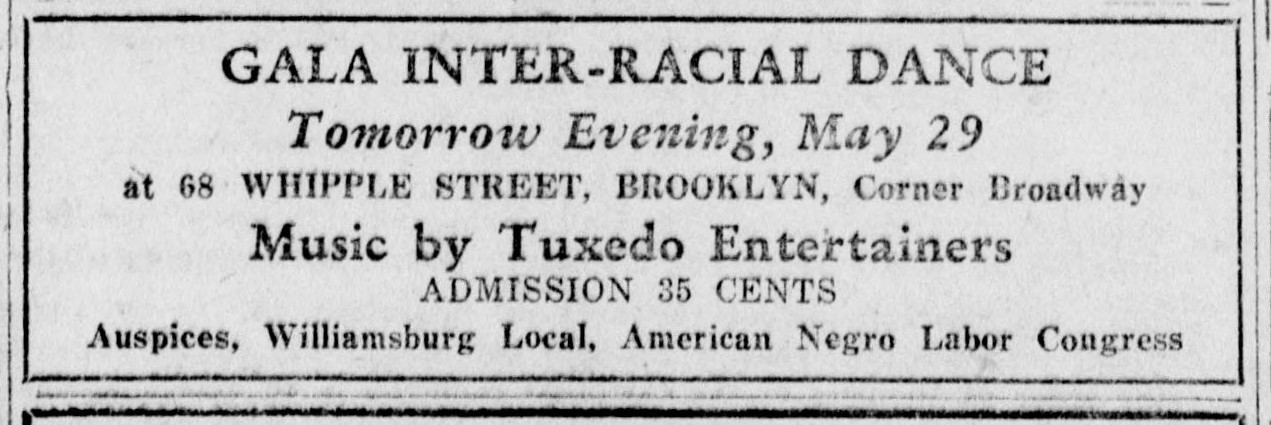 Gain Inter-Racial Dance. Thursday. May 29. 68 Whipple St. Brooklyn, corner Broadway. Tuxedo entertainers. Admission 35 cents. Auspices Williamsburg Local A.N.L.C.