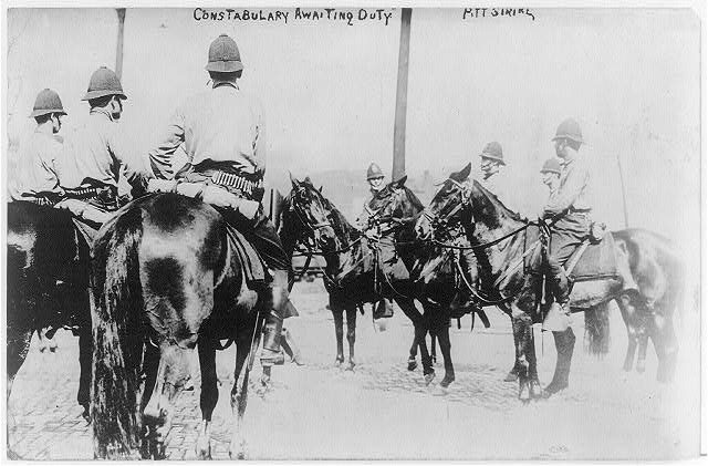 No time was lost in the organization of the newly created State police, called constabulary. But the hasty passage of the law, the unusually large appropriation made for the purpose of organizing a “small patrolling body,” the almost dictatorial powers vested in its commander, and the latter’s militant attitude from the very beginning, soon began to arouse misgivings on the part of organized labor. But their fears were quickly allayed with the assurance “from authoritative sources” that “honest workingmen had nothing to fear” from the constabulary. These were merely to patrol the outlying, unprotected districts; they would not mix in local affairs; they had nothing to do with strikes; they’d be good.