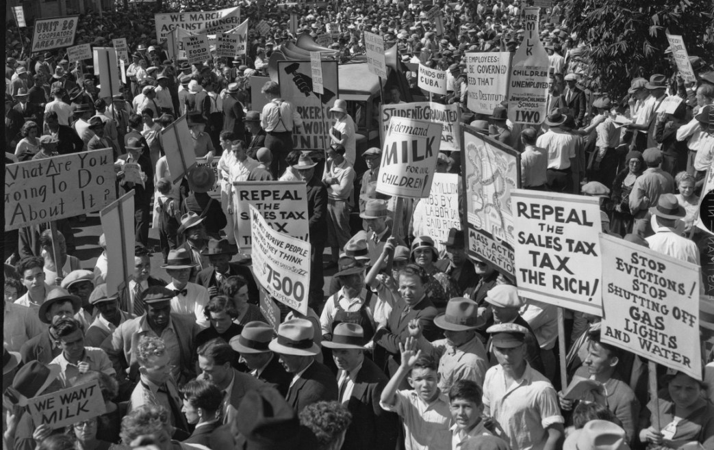 The concentration of capital in powerful concerns and their connection with big finance renders the position of the capitalist employers much stronger than the workers’. Powerful industrial magnates reign as monarchs over large masses of workers; they keep them in absolute subjection and do not allow “their” men to go into unions. Now and then the heavily exploited wage slaves break out in revolt, in a big strike. They hope to enforce better terms, shorter hours, more humane conditions, the right to organise. Union organisers come to aid them. But then the capitalist masters use their social and political power. The strikers are driven from their homes; they are shot by militia or hired thugs; their spokesmen are railroaded into jail; their relief actions are prohibited by court injunctions. The capitalist press denounces their cause as disorder, murder and revolution; public opinion is aroused against them. Then, after months of standing firm and of heroic suffering, exhausted by misery and disappointment, unable to make a dent on the ironclad capitalist structure, they have to submit and to postpone their claims to more opportune times.