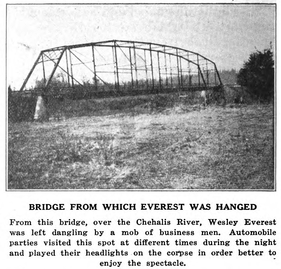 ON Armistice Day, Nov. 11, 1919, a mob broke into the I.W.W. hall at Centralia, Washington, and five of them were killed. The attackers came from a passing parade of ex-service men. The same day an ex-service man, Wesley Everetts [Everest] by name, was seized by a mob, dragged through the streets and lynched. The lynchers of Wesley Everetts are known. They have not been indicted. They will never be tried for their crime. That is because Wesley Everetts was a member of the I.W.W.