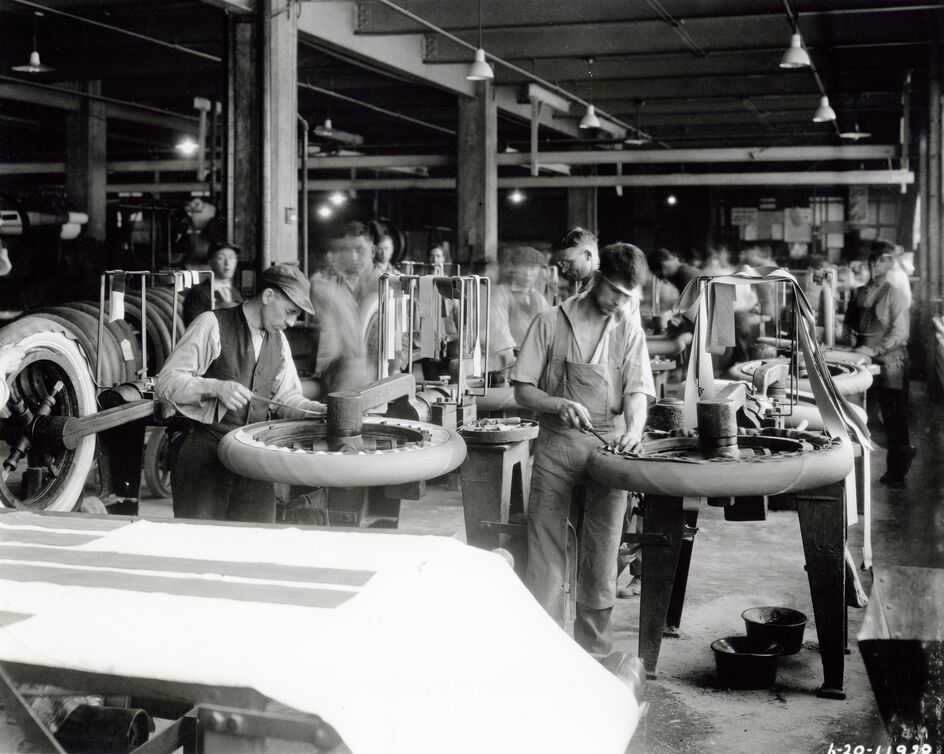 The 75,000 rubber workers of Akron of 1920 were permanently reduced to less than 45,000 by 1930 due to technological developments in the industry. Productivity per rubber worker more than doubled, wages remained stationary. The cost of 17 tire price wars in the virtually bankrupt industry was foisted on the rubber workers in the form of wage cuts.