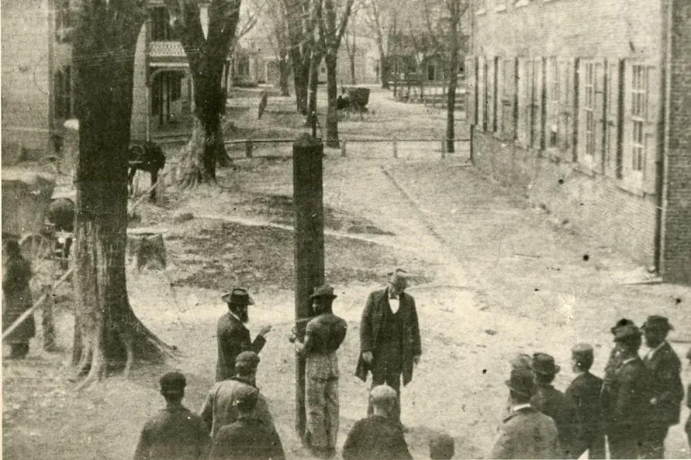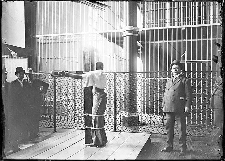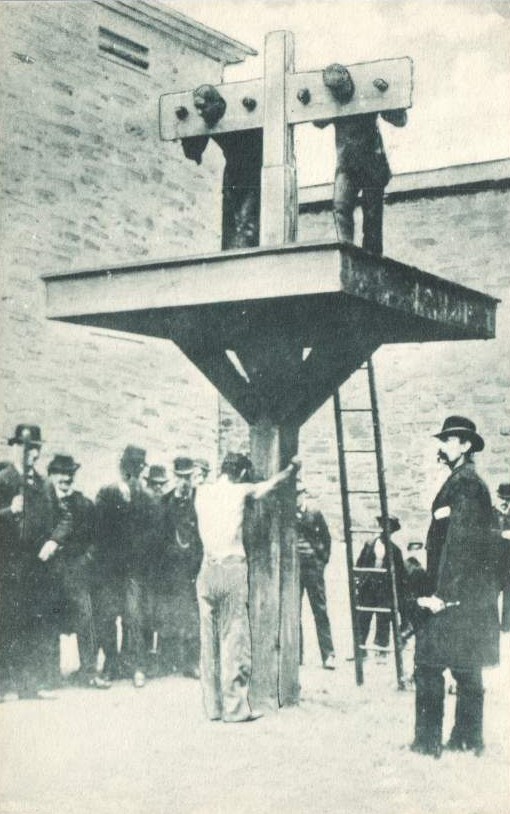“With hands tied to the extended arms of a cross and with backs bared to the zero gale two men were mercilessly lashed in the courtyard of the county workhouse here today, part payment of the toll the state exacts for their crime. John Brewington received forty lashes with a cat o’ nine tails in addition to which he will serve two years in state prison for highway robbery. Arthur Johnson received twenty lashes and will serve one year for larceny.”