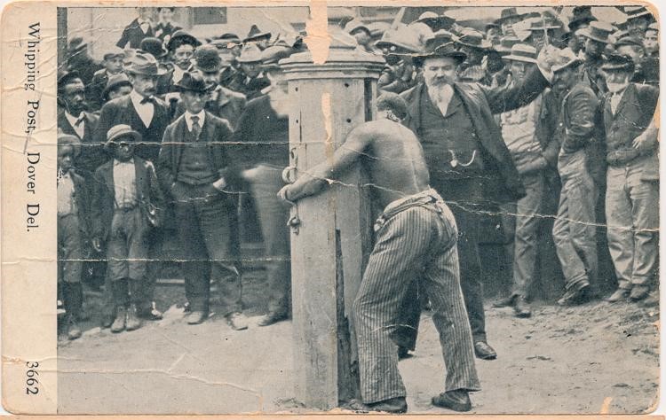 “The men suffered frightfully from the cold and from the blood-letting lashes and staggered, semi-conscious, back to their cells. The whipings, as are all Delaware whippings, were public and a morbid crowd stood against the prison walls and saw the heavy leather strap with its nine thongs cut deep into the quivering flesh of the wretches.”