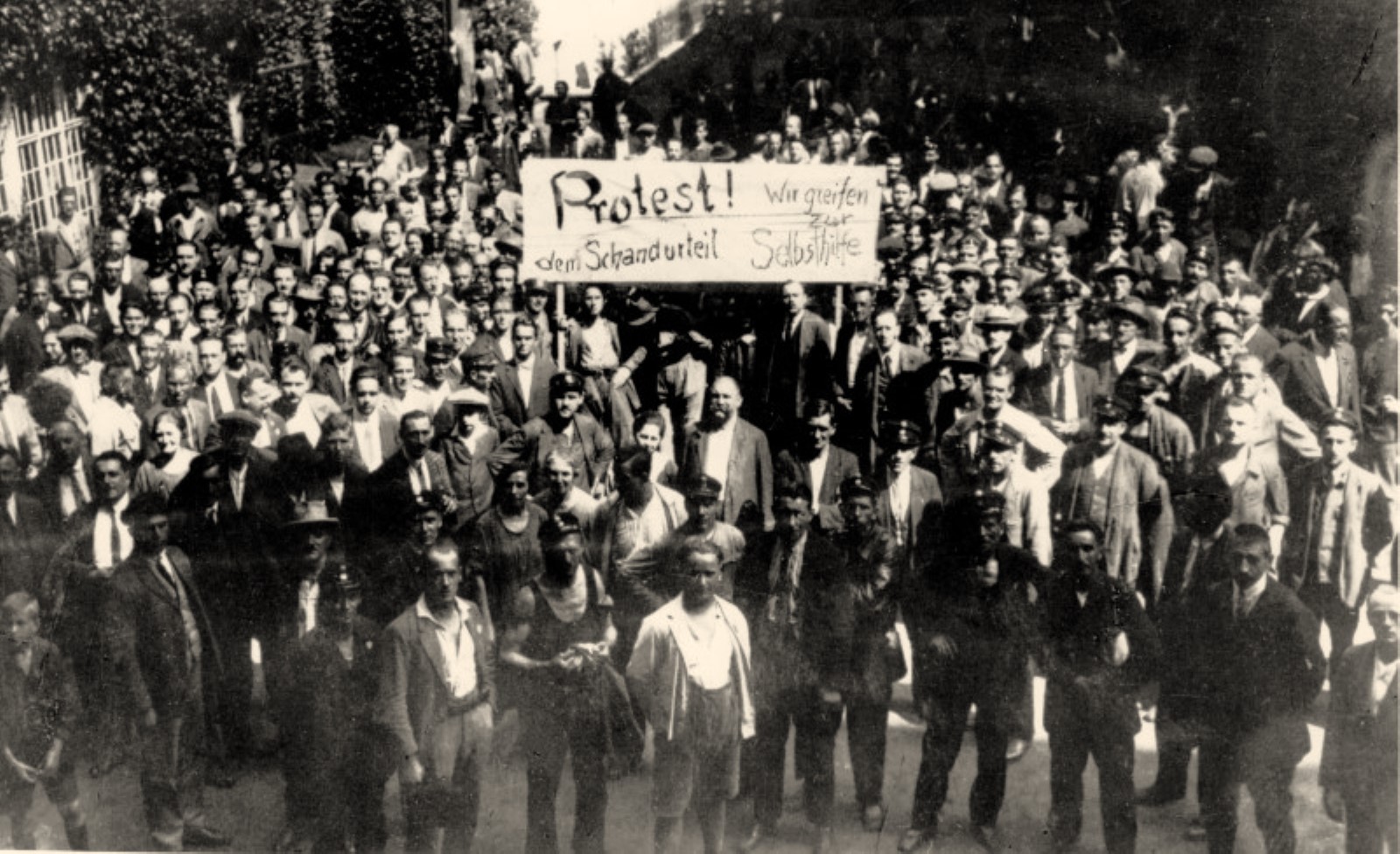 The working class of Vienna rose up on July 15, 1927 in a rebellion, Wiener Justizpalastbrand, against the police and the courts. A general strike was called against the acquittal of nationalists for the murder of two Social Democrats at a rally earlier that January. Beating back the police and erecting barricades, Vienna laid siege to, and then burned down, the Palace of Justice. As security forces fought to regain the city, hundreds were wounded and killed in street fighting and police massacres.
