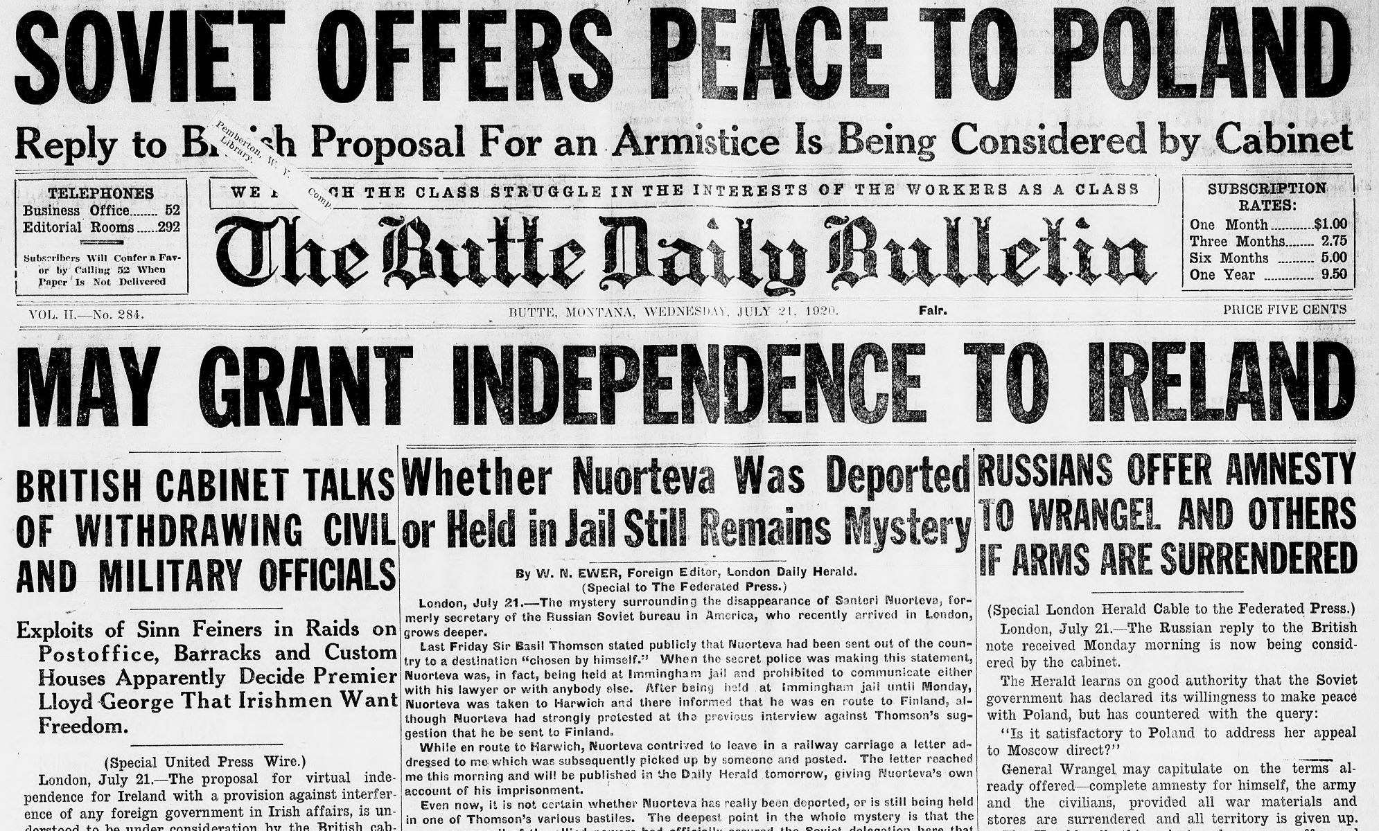 The Butte Daily Bulletin began in 1917 in reaction to the labor wars in Montana, the Speculator Mine fire killing 168 miners; IWW organizing, and the murder of IWW organizer Frank Little in Butte. Future Communist leader and IWW organizer William F. Dunne and R. Bruce Smith, president of the Butte Typographical Union published the paper as an outgrowth of a strike bulletin with the masthead reading, “We Preach the Class Struggle in the Interests of the Workers as a Class.” It became daily in August 1918 and in September 1818 officers raided their offices and arrested Dunne and Smith on sedition charges. An extremely combative revolutionary paper, while unaligned, it supported the struggles of the Left Wing in the SP, reflecting the large radical Irish working class of Butte also supported Ireland’s and the Bolshevik revolution, as well as the continued campaigns of the IWW locally and national as well as the issues in Butte. It ran until May 31, 1921.