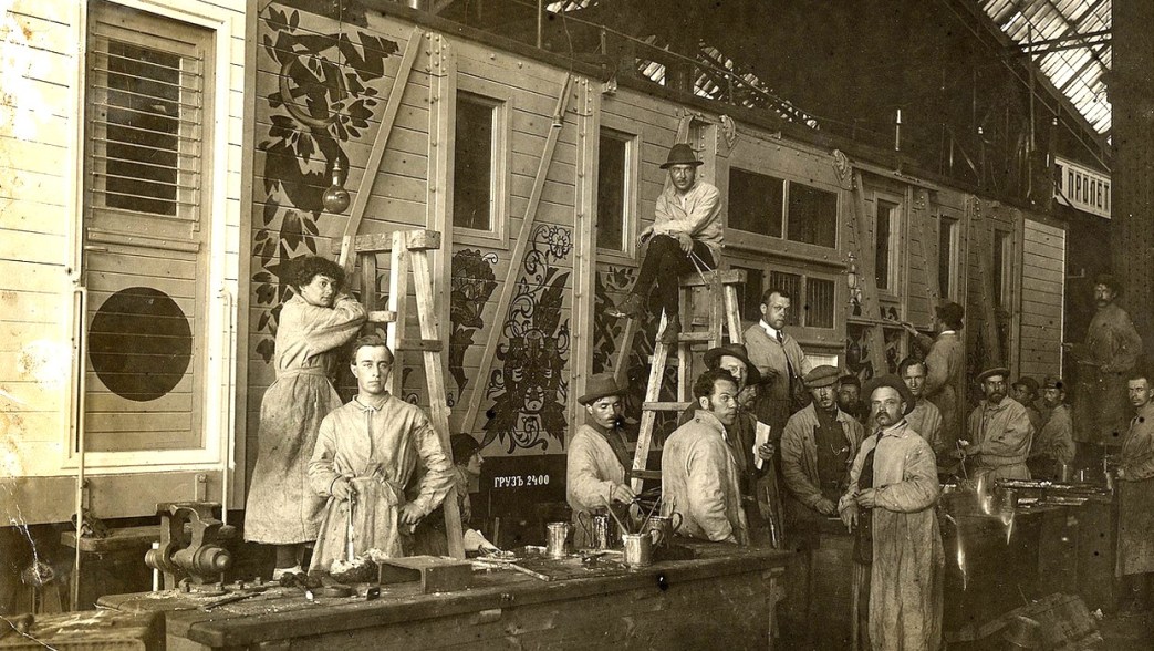 The outside walls of the trains are painted with pictures and watchwords. Futurism has already done away with, and the paintings are now of a purely realistic character.
