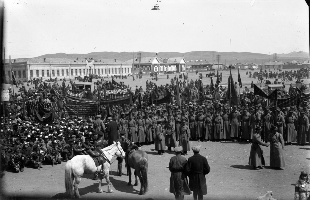 A regiment of the Peoples Army debouches into the square — off for a practice march. The red star with its Mongol emblem on their caps. Over the new municipal building, over the trade union headquarters, over the Mongol Peoples Publishing House, over the Peoples House, over the headquarters of the Revolutionary Youth, over the Peoples University, over the Peoples Government House, over the headquarters of the Mongol Peoples Revolutionary Party, fly crimson flags.