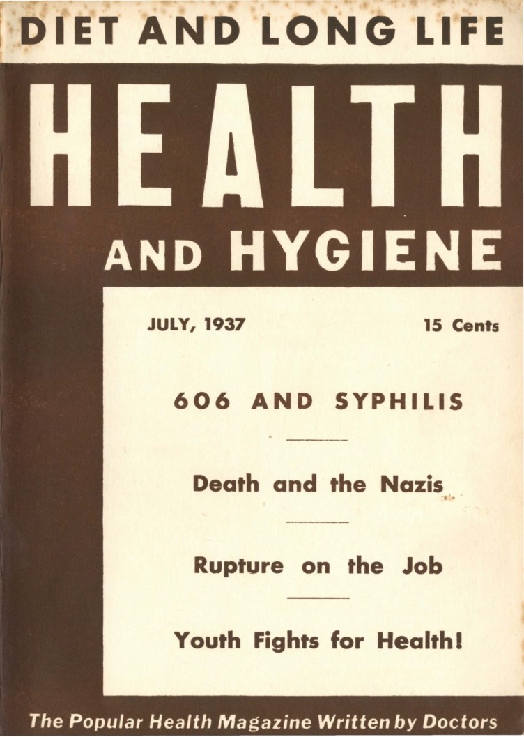 Contents: Health Ads-99.44% Bunk, 606 and Syphilis, First Aid in Poisoning, Death and the Nazis, Rupture on the Job: How to Get Compensation, The Treatment of Hernia, Youth Fights for Health: The Struggle Against Disease and Depression, Surveying the Hospitals, Diet and Long Life by Prof. Henry C. Sherman, The A.M.A. Stirs but Does Not Move, Editorial, Readers’ Medical Questions Answered.
