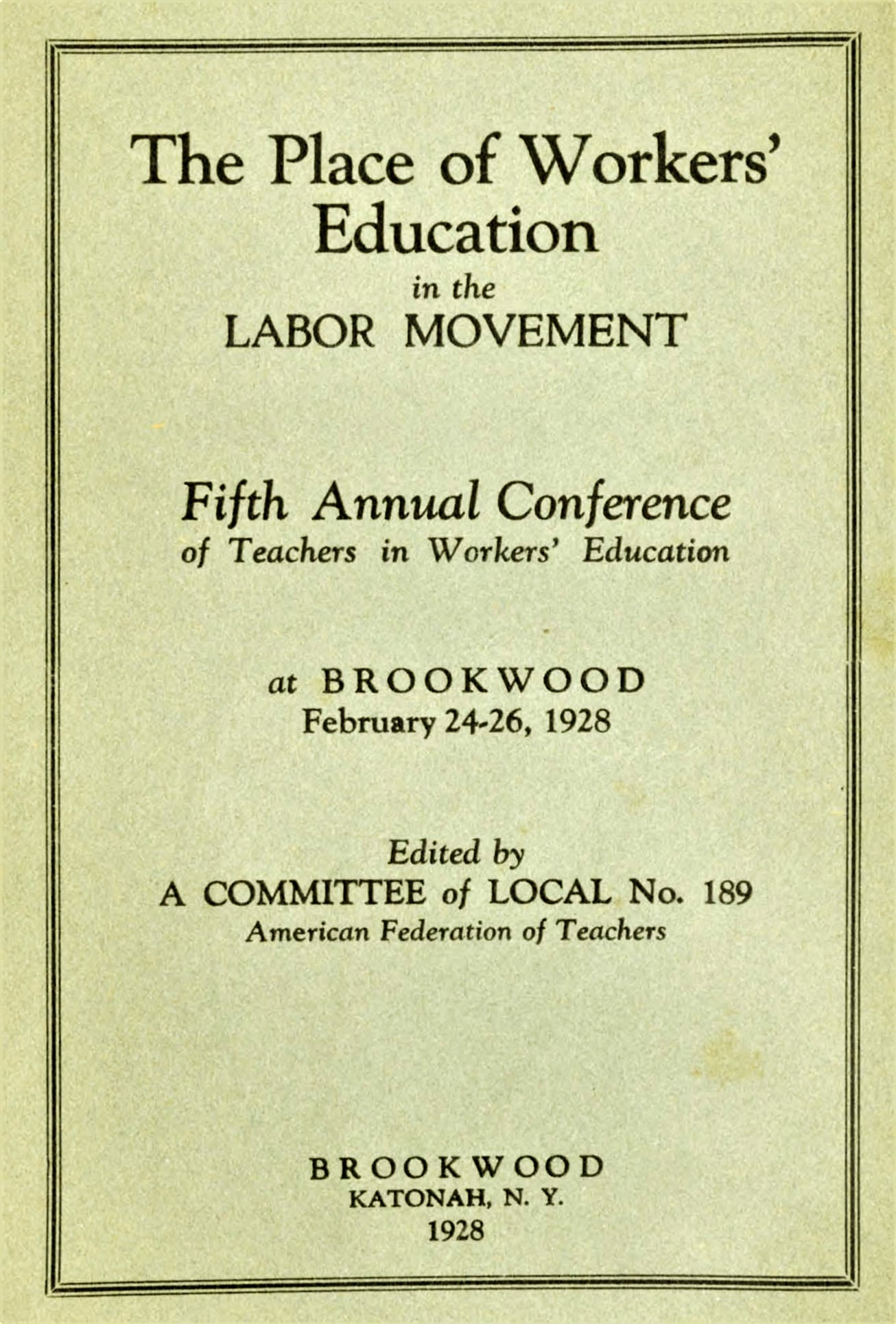 The Place of Workers’ Education in the Labor Movement: Fifth Annual Conference of Teachers in Workers’ Education. Brookwood Labor College, February 24-26 1928. Katonah, New York. 1928.