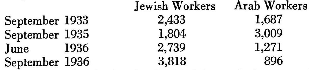 Furthermore, take the fact that in Palestine there are two cities of mixed population where the Jews are in the majority, Jerusalem and Haifa. In both places, nevertheless, in accordance with the decrees and appointments of the government, the mayors are Arab. The Jews are as little privileged in the matter of budget expenditures as of municipal administration. The Jews contribute 63 percent of the government income, whereas in return they receive merely 14 percent (1934–35) of the government expenditure on education, only 34 percent of the public works expenditures, etc. Nor are they privileged in the matter of labour legislation.