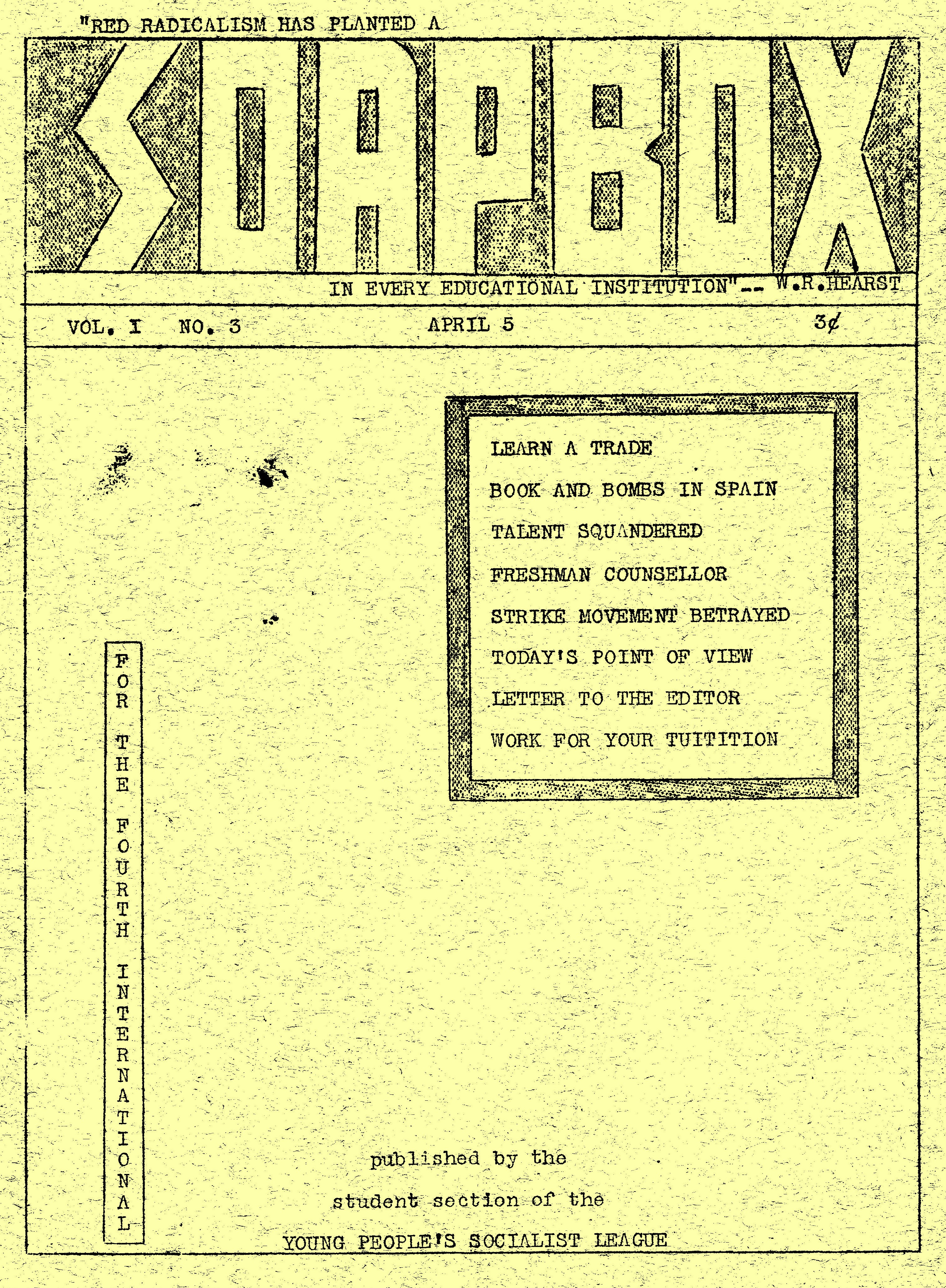 Soapbox (Young People’s Socialist League-Student Section, Los Angeles). Vol. 1 No. 3. April 5, 1939.