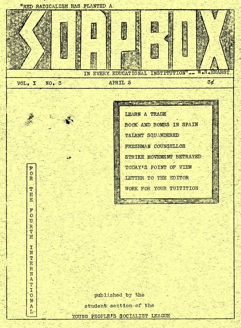 There have been a number of periodicals named ‘Soapbox’ in our history. This Soapbox was the paper of the student section of the Young People’s Socialist League of the Socialist Workers Party to use on school, college, and university campuses. Only printed in 1939, this edition is from UC Berkeley.