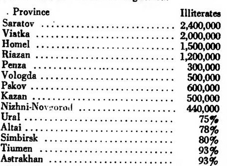 All over the Republic an enormous number of literacy schools have been opened; 10,000 schools were opened by the middle of Spring in the province of Cherepoviets alone; in the province of Tambov—6,000 schools, which were attended by 48,000 pupils m the month of April; in the province of Simbirsk—6,000 schools, in the province of Kazan—5,000 schools, which were attended by 150,000 pupils; in the province of Viatka 4,000 persons were attending the literacy schools, even before the decree was issued.