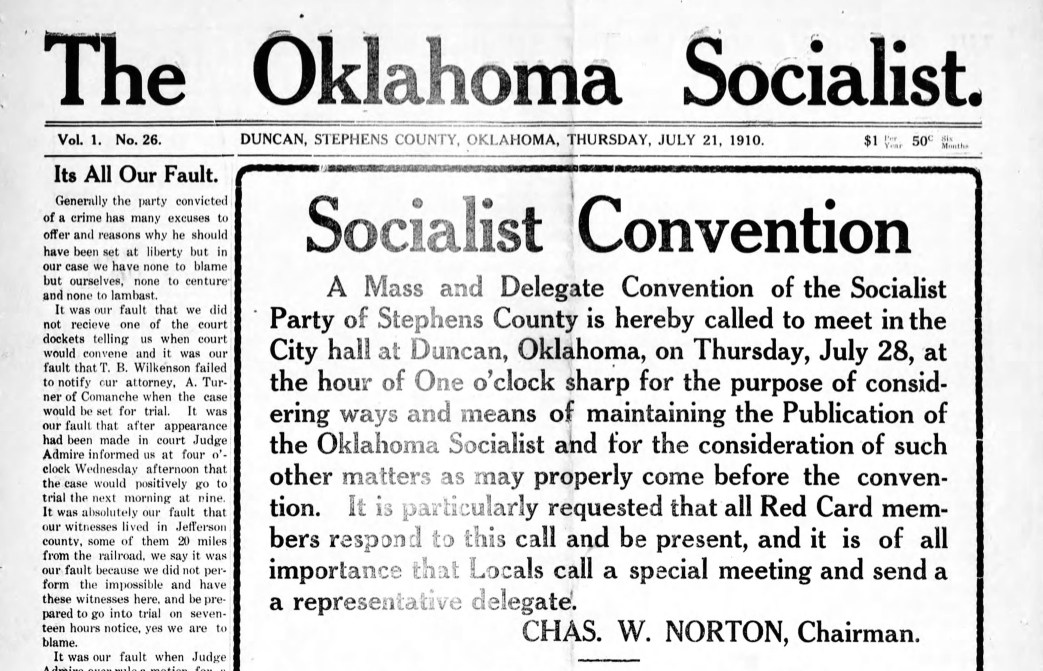 The Oklahoma Socialist, published in Duncan, Stephens County was one of dozens of such papers in the party’s 1908-1916 heyday in which the Oklahoma, with its 10,000 members and 20% vote share, had the highest percentage of Socialists of any state. Begun in 1910 and edited by Charles W. Norton and William Bonner. The paper replaced the short-lived Addington Advertiser, was issued weekly for around a year when editor Norton was almost lynched, and jailed for ‘libel.’
