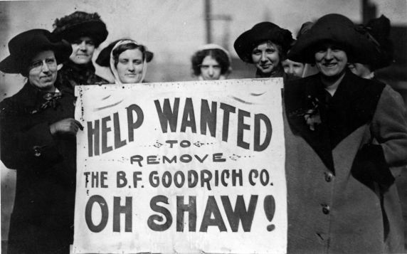 On Friday evening two thousand pickets, led by M.A. Durso. I.W.W. organizer; Mrs. Margaret Prevey, Socialist lecturer, and Fred Miles, carrying an American flag, marched in double column past the gate of the Goodrich Rubber Co., on the west side of the street and back on the other side in an endless chain, asking the workers on the inside to join the strike. When the whistle blew for the 5:30 shift to leave the plant, the police ordered the crowd to the east side of the street. Calling attention to a city ordinance which allowed them to remain as they were, the crowd refused to go.