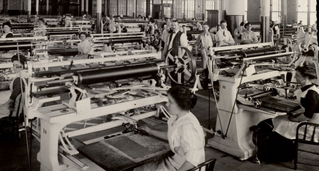 The dye houses work day and night. The heat in some of the processes such as dyeing and drying is that of the tropics. The steam is so thick you cannot see the worker opposite you. Dangerous machines stand in this fog, and workers constantly run the risk of serious accidents from walking into them. The atmosphere is unbearable, filled as it is with the fumes from bleaches, acids and other chemicals. Floors are running with water, so that workers must wear rubber boots or wooden shoes for protection. Clothes are dripping with steam and perspiration. Yet workers are forced to work, ten, twelve, even fourteen hours a day or night during the rush season, and are left totally unprovided for in slack season when the market is glutted and mill owners hold their stocks of materials for better prices.
