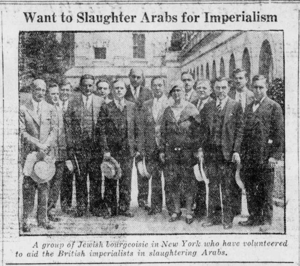 “The Arabian peasants are driven from their land which is transferred to the Zionists. So what happens? The Arabian masses, spurred on by the Arabian large land owners take up the fight against the Jewish masses. The Jewish and Arabian masses must join in a common struggle against British imperialism and the Jewish Zionists.”